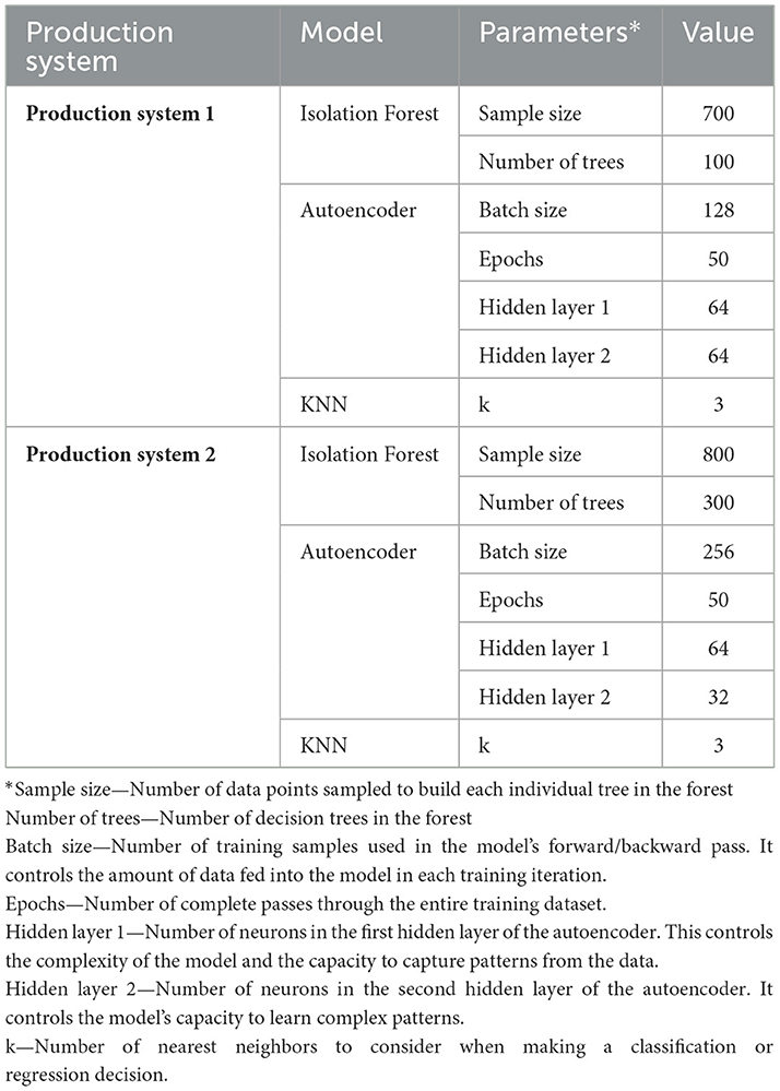 The models employed in this study represent distinct anomaly detection approaches, each with its strengths and limitations. Isolation Forest is known for its efficiency, scalability, and ability to detect anomalies without assumptions about data distribution, making it suitable for high-dimensional data (28, 29). However, its performance may decline with highly imbalanced datasets or when anomalies closely resemble normal instances (45). In contrast, Autoencoders use neural networks to capture complex, non-linear relationships within high-dimensional datasets, making them effective for detecting subtle anomalies (22). However, they can be computationally intensive and require careful tuning to avoid issues related to training anomalies and generalization (45). KNN, a non-parametric model that requires minimal parameters, is versatile for both classification and regression tasks. However, it struggles with high-dimensional data and is prone to overfitting (46). Despite these limitations, all models provided valuable insights into production behavior during anomalous and non-anomalous weeks (Table 2).
