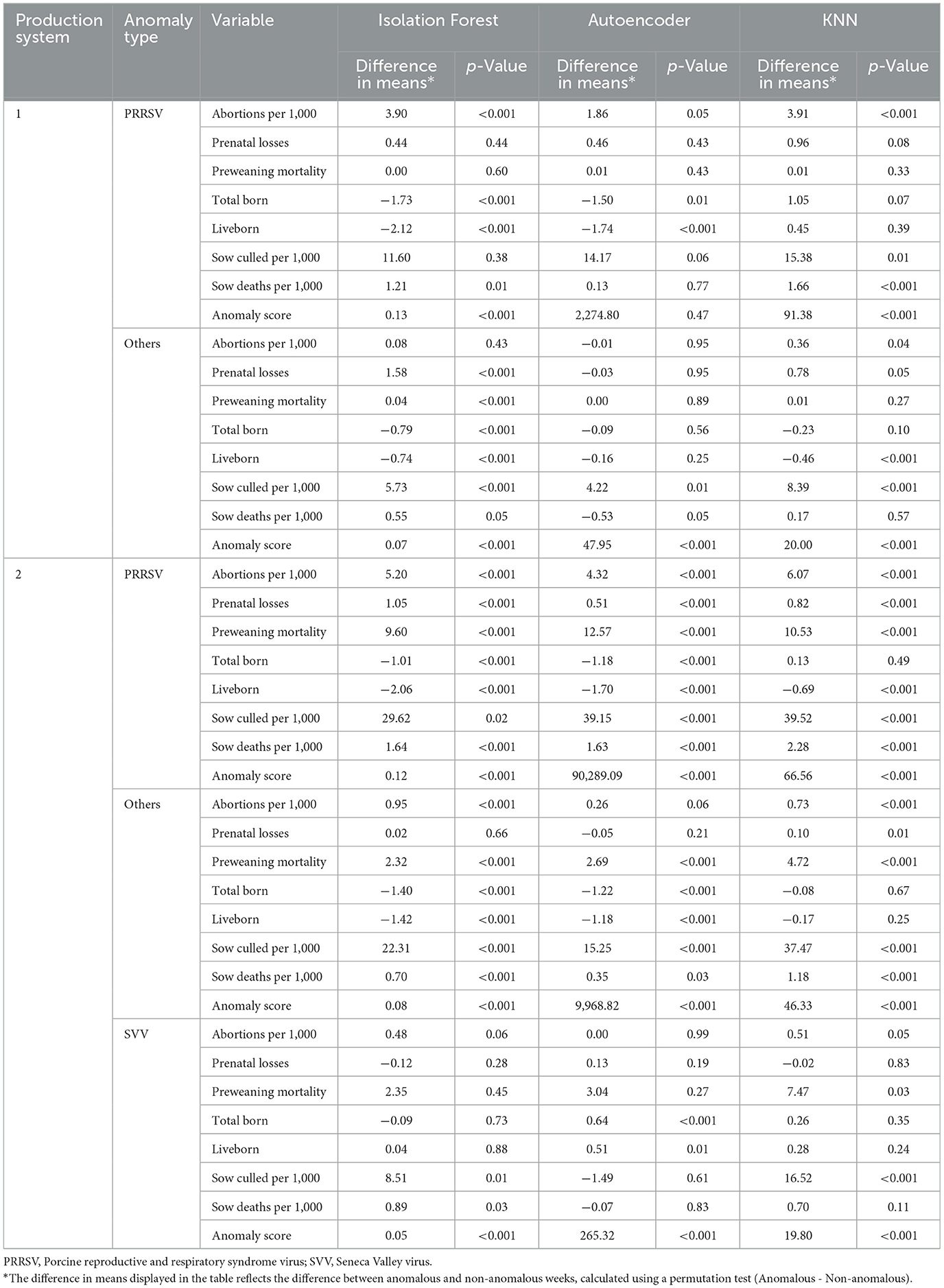 Results: The models identified 336 anomalous weeks and 1,008 non-anomalous weeks in Production System 1, and 1,675 anomalous weeks and 5,025 non-anomalous weeks in Production System 2. The results from the permutation test revealed significant differences in productivity indicators between anomalous and non-anomalous weeks, especially during PRRS outbreaks, with more subtle changes observed during Seneca Valley virus outbreaks. The models performed well in detecting the PRRSV anomaly, achieving perfect precision (100%) across all models for both production systems. For anomalies like SVV the models showed lower performance compared to PRRSV.
