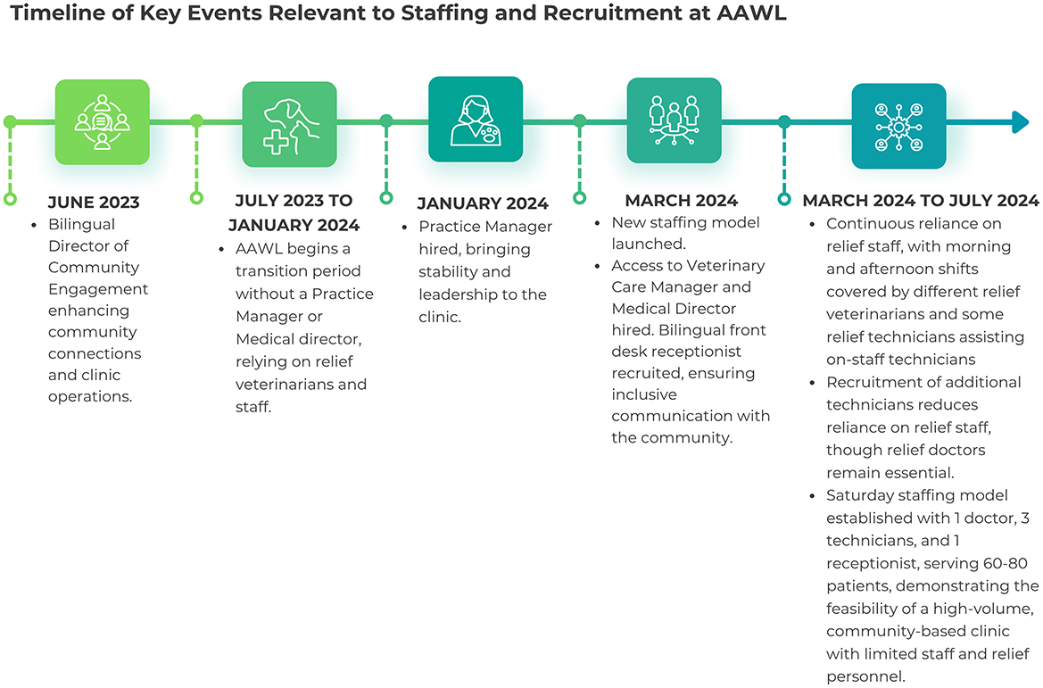 AAWL's new clinic model emphasized the importance of bilingual staff to effectively serve the community. In response to staff turnover and survey insights, two key bilingual roles were created: Director of Community Engagement and Access to Vetcare Manager. These roles were crucial in connecting with the Latino community and managing the clinic's operations. The Director handled outreach logistics and partnerships; the Access to Vetcare Manager focused on relationship-building and overseeing off-site services. Figure 1 presents a timeline of key staffing and recruitment events between June 2023 and July 2024, illustrating the clinic's evolving personnel structure during the transition period.
