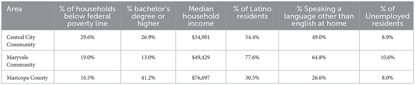 Table 1. Socioeconomic and demographic comparisons of Central City, Maryvale, and Maricopa County (11, 30–32).