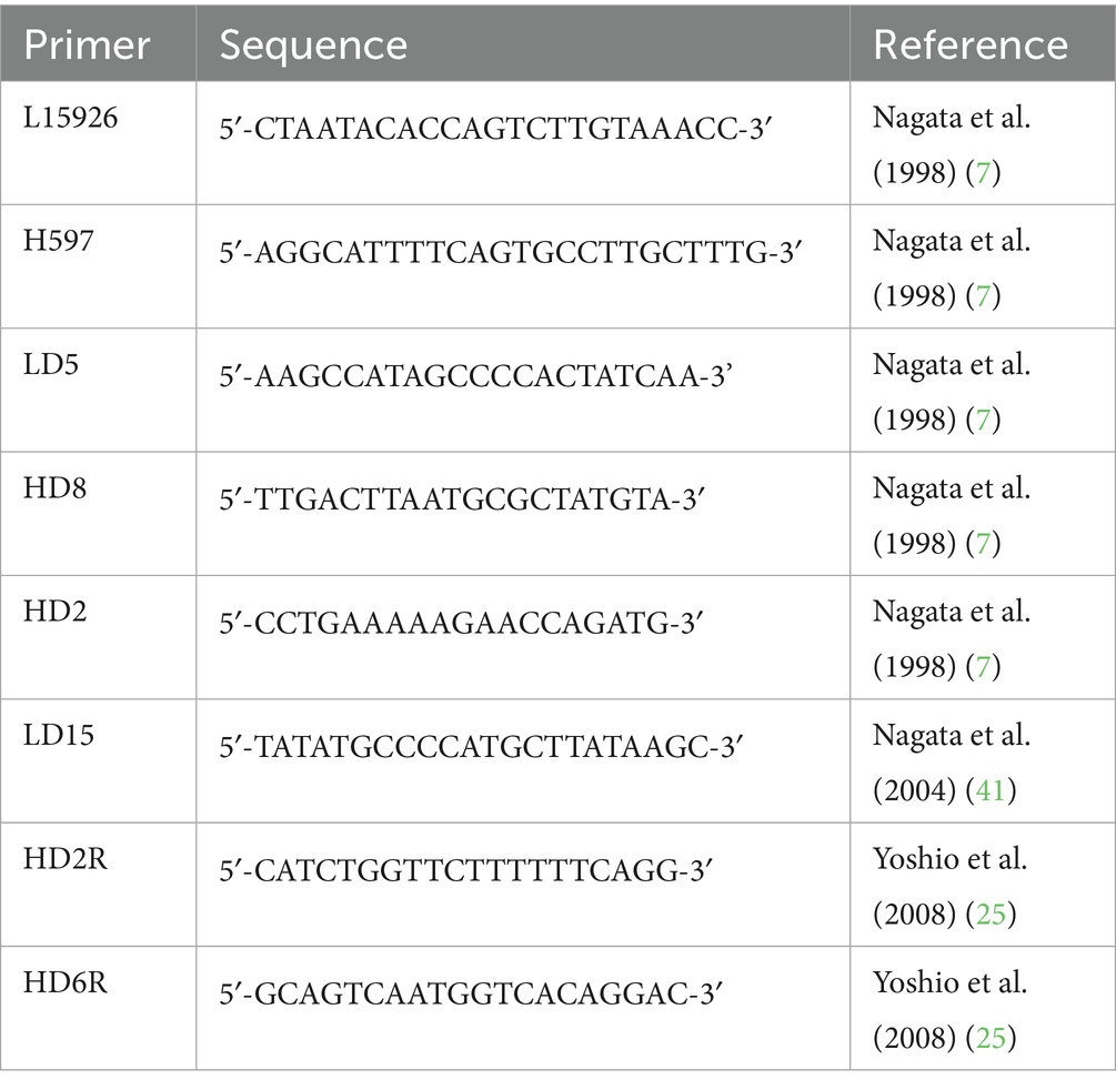 The amplified PCR products were purified according to protocol using ExoSAP-IT Express (Thermo Fisher Scientific Inc., USA). The purified products were sequenced by direct sequencing by Eurofin Genomics Inc. Eight primers were used for direct sequencing, which were prepared according to the reports of Nagata and colleagues (7), Nabata and colleagues (41) and Yoshio and colleagues (25) (Table 1).