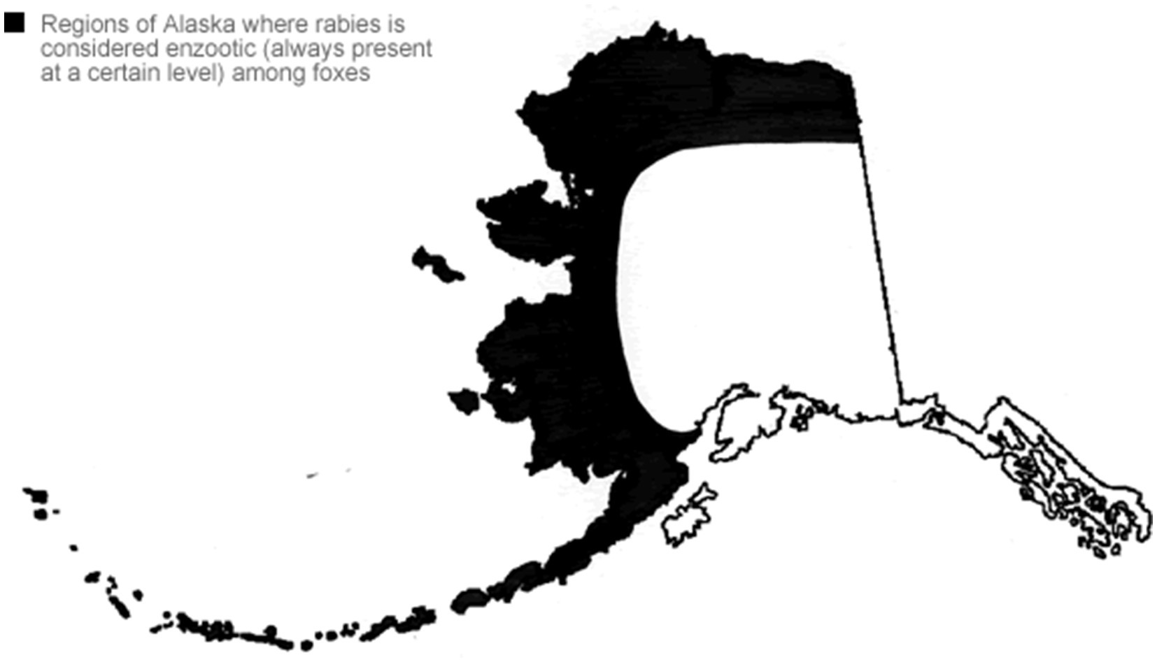 The scope of rabies in wildlife reservoirs in Alaska is currently unknown due to the vast land mass and high wildlife populations in the state (12).