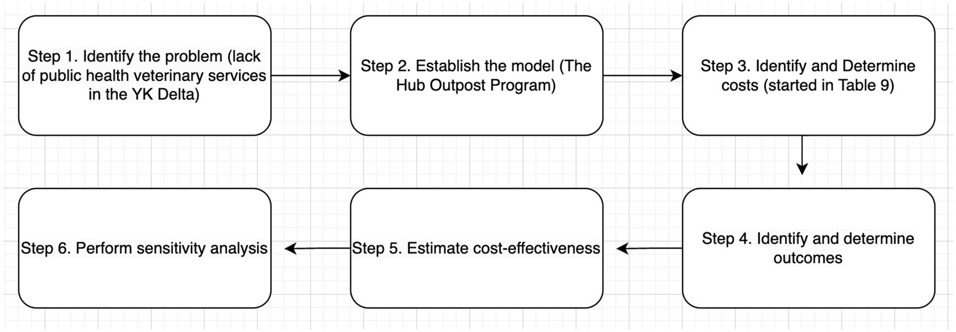 This paper begins the work of assessing some of the costs associated with not having a public health veterinarian to respond how dogs impact on public health in the YK Delta of Alaska. However, the authors have not conducted a true economic cost: effectiveness analysis. It is critical to understand the costs of available interventions as a vital consideration in policymaking within healthcare. Such an analysis is recommended to further examine true costs when access to public health veterinary medicine is not available in YK Delta. Using an adopted diagram (62) Figure 3 as a guide, future cost-effective analyses may begin using data from HOP in the first three steps.