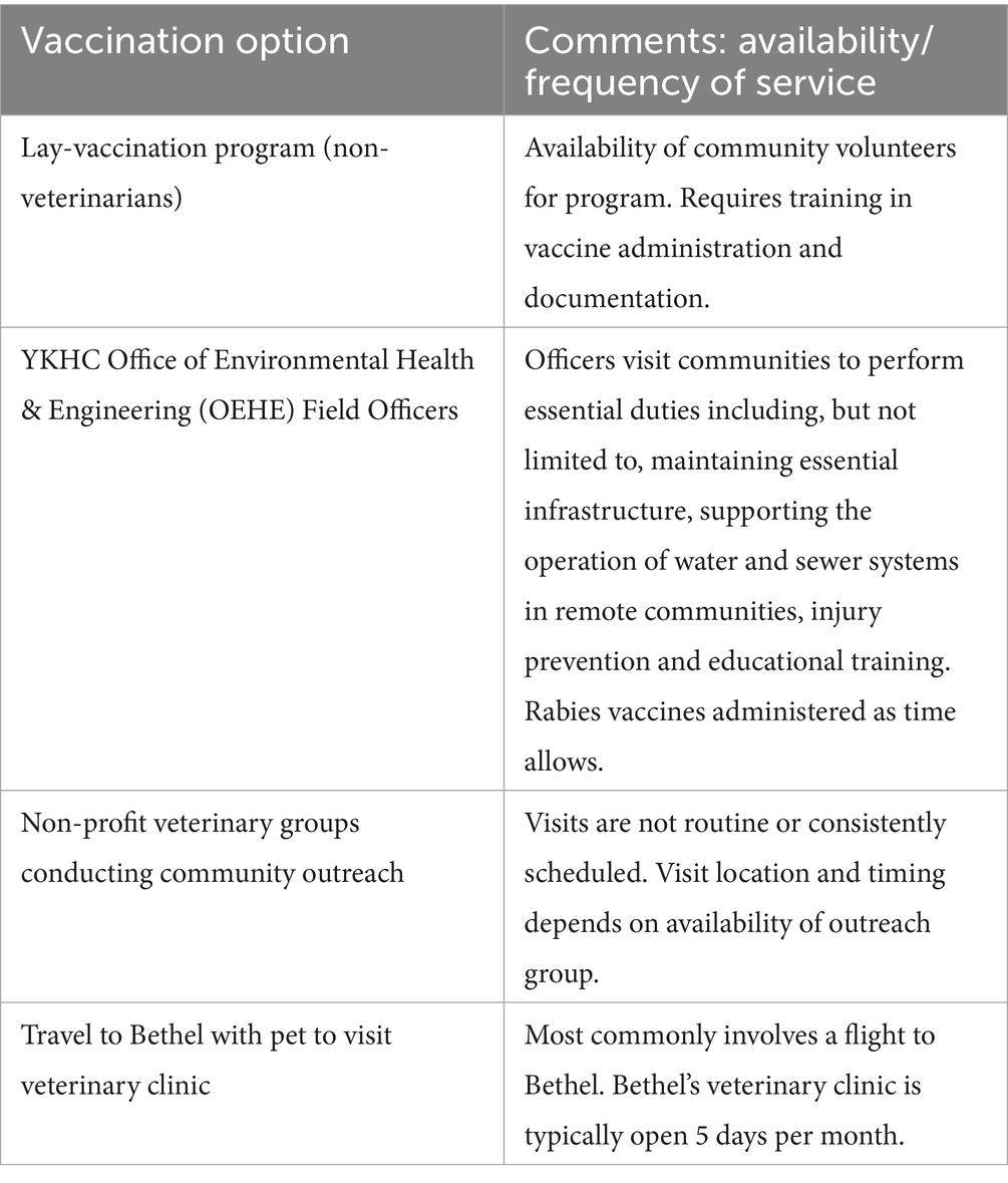 Due to the lack of consistent access to veterinary medical resources in the YK Delta, rabies vaccination of domestic animals typically occurs one of the following ways: Lay-vaccination program (non-veterinarians), YKHC Office of Environmental Health & Engineering (OEHE) Field Officers, Non-profit veterinary groups conducting community outreach or travel to Bethel with pet to visit veterinary clinic. These are further explained in Table 1.