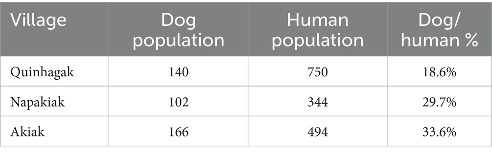 In a dog census completed by HOP, personnel went door-to-door to ask residents about the number of dogs they owned. As shown in Table 2, a total of 140 dogs were counted in Quinhagak, human population 750; 102 dogs in Napakiak, human population 344; 166 dogs in Akiak, human population 494. The percentage of dogs per person in these three communities ranged from 18.6 to 33.6% of dogs per person.