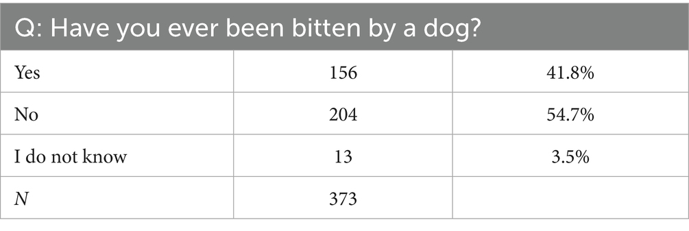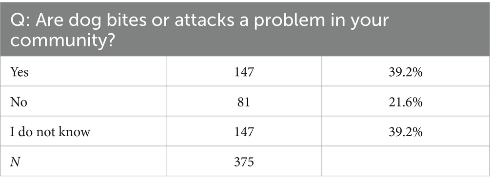 The HOP can provide up-to-date insight to the relevant reports on dog bites in the YK Delta. In a paper, Community Perspectives on Dogs, Health Risks, and Veterinary Care Impacts in Rural Alaska (50), HOP surveyed YK Delta residents from communities visited about dog bites in their communities. As shown in Table 4, among the 375 survey respondents, 39.2% felt dog bites and attacks were a problem in their communities, and Table 5 shows nearly 42% of respondents reported being bitten by a dog. However, not all dog bites are reported to health care workers (51).
