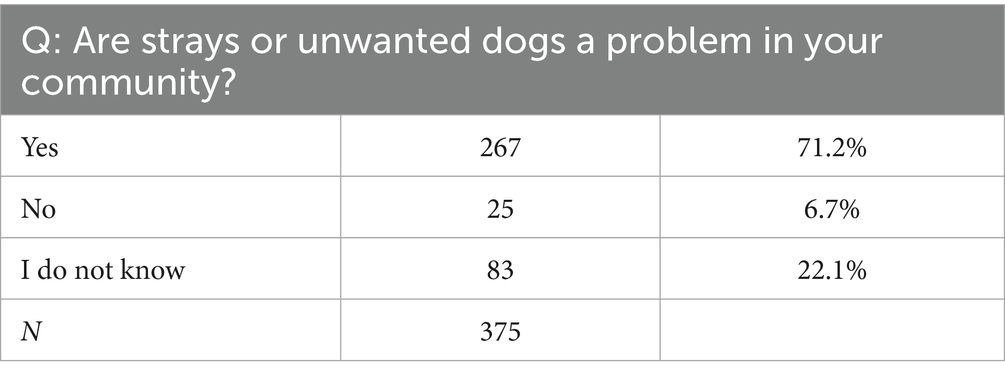 In the same paper on Community Perspectives, analysis reveals that most community members believe stray/unwanted dogs are a problem (71.2%, Table 6), and report counting ten or fewer loose dogs per day (approximately 82%), with some reports of more than 25 (approximately 5% of respondents). Most community members report that dogs do not typically have identification (47.7%), about a quarter reporting that they do have identification (28.2%), and 24.1% are unsure if they have identification.