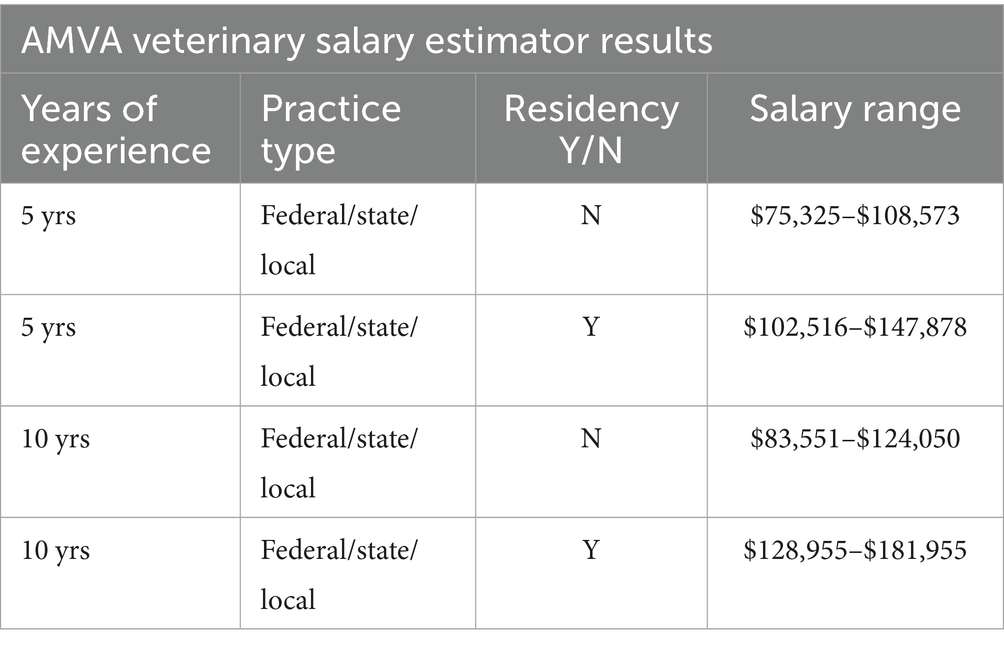 57. Veterinary Salary Estimator for New Veterinarians – AVMA My Veterinary Life. Available online at: https://myvetlife.avma.org/new-veterinarian/your-financial-health/veterinary-salary-estimator (Accessed January 02, 2025)