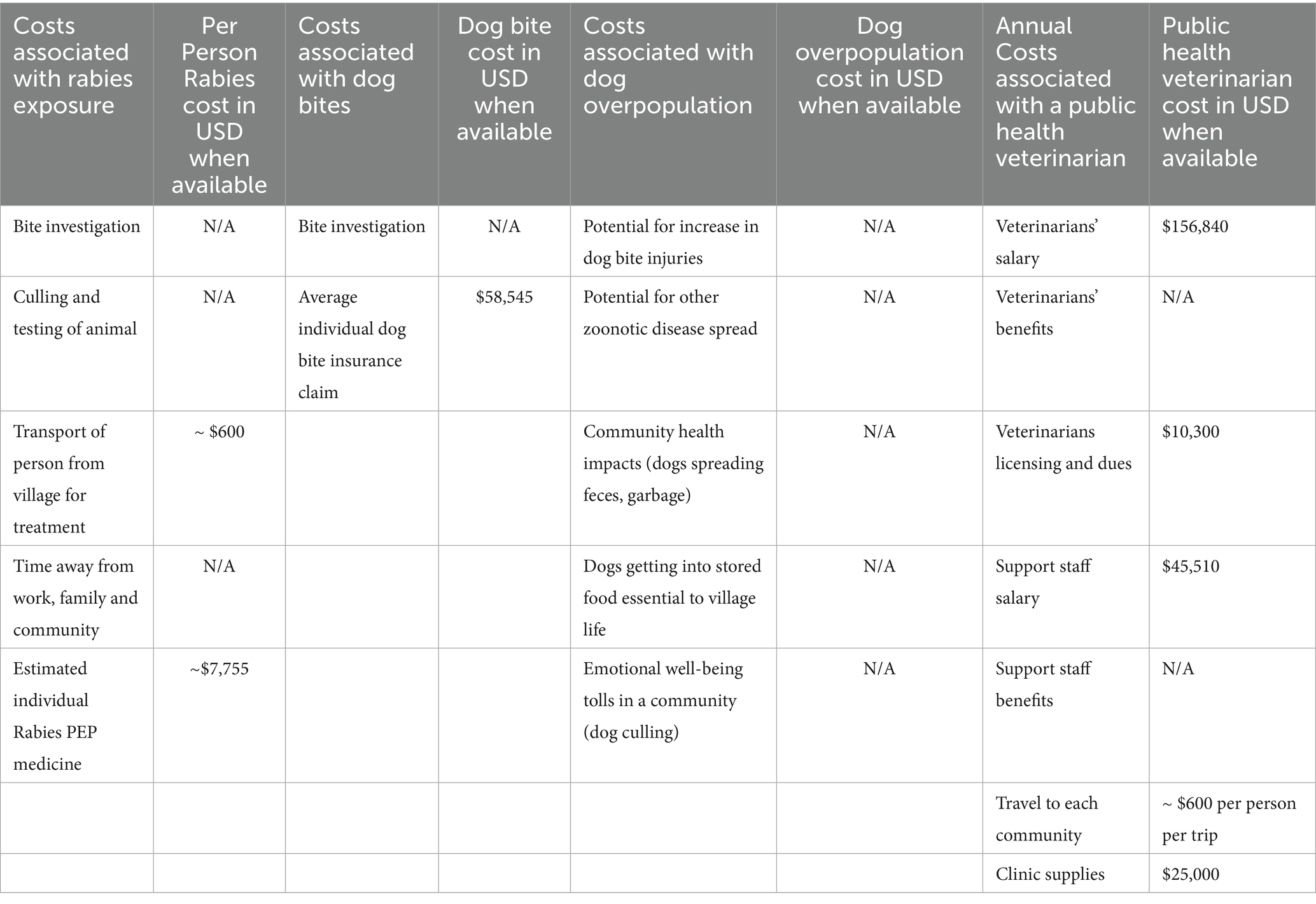 Information on the costs associated with rabies exposure, impact of dog bites and dog overpopulation, and costs of implementing a veterinary professional were gathered from literature, governmental websites, HOP operations data, and authors’ personal experiences. Specifically, the World Health Organization (WHO) and Center for Disease Control and Prevention (CDC) websites were searched as well as using the search engine Google to find additional sources was searched for costs associated with rabies exposure using search terms “rabies” and “exposure,” “cost,” and “expense.”
