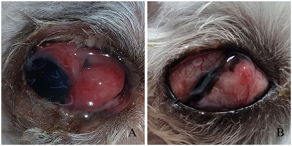 Proptosis can result in severe ocular and periocular damage, often necessitating enucleation or globe replacement surgery, depending on the severity of the injury. Even with timely and appropriate intervention to preserve the globe, long-term complications such as blindness, strabismus, mild exophthalmos, lagophthalmos, corneal sensory deficits, keratoconjunctivitis sicca, exposure keratitis, glaucoma, and phthisis bulbi may still develop. Among these complications, strabismus arises from damage to the extraocular muscles, with lateral strabismus being the most frequently observed. This condition typically results from damage to the medial rectus muscle, which is the shortest and most vulnerable of the extraocular muscles, as noted in Gelatt's Veterinary Ophthalmology (2) and other textbooks (3–5). A study by Ali et al. (6) investigating traumatic proptosis and its postoperative complications in small-breed dogs reported that all 15 dogs exhibited medial rectus muscle damage following globe replacement surgery.