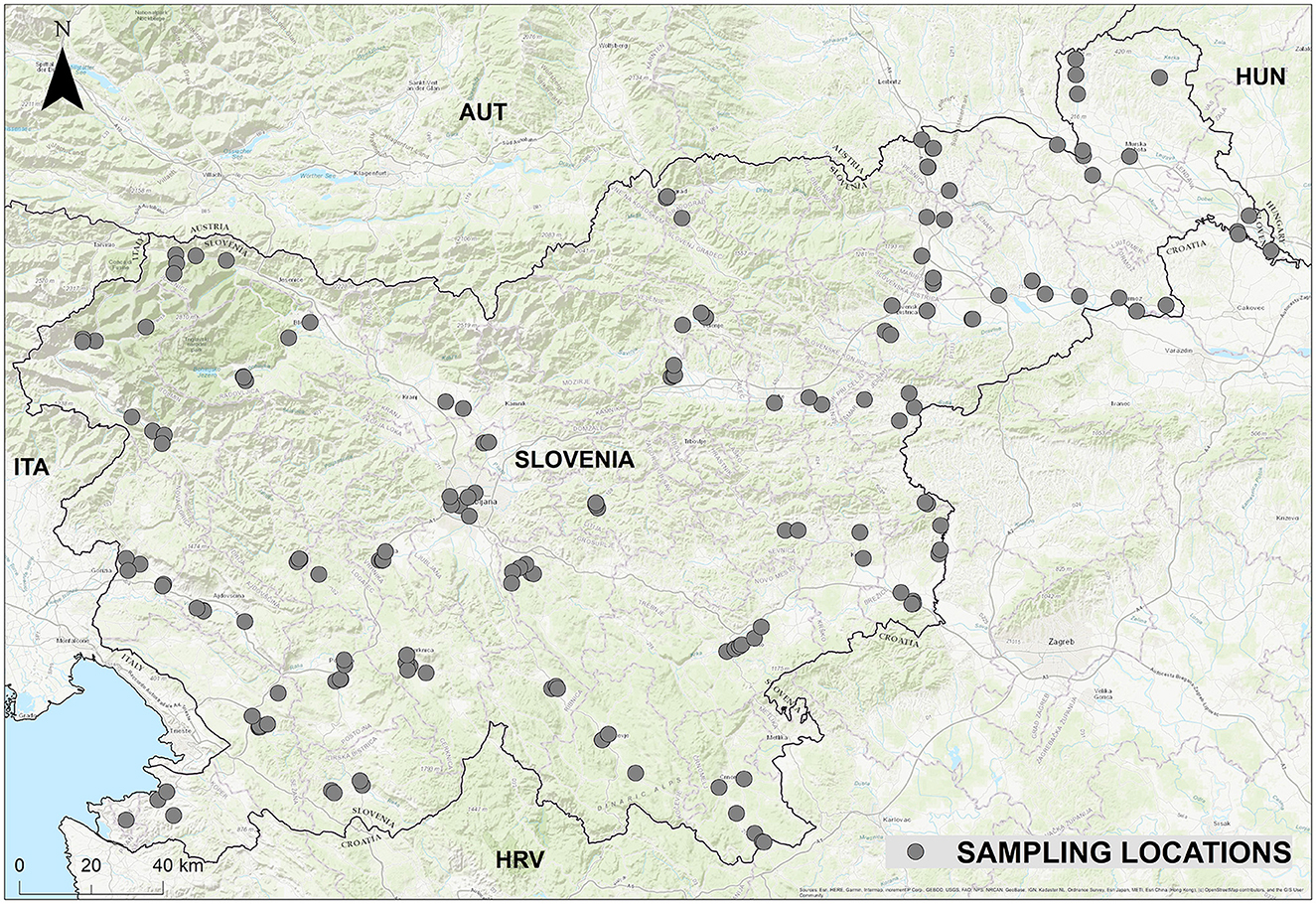 Prior to this study, data on the abundance of sandflies in Slovenia was incomplete, as these insects had only been studied in the coastal region and not in the continental part of the country until 2019. To fill this gap, a nationwide surveillance programme with systematic random sampling was carried out, covering a total of 226 sampling sites to ensure comprehensive geographical coverage (Figure 1). Sampling sites were selected to represent a variety of habitats, including suitable environments such as stone walls near human settlements, agricultural and tourist farms and animal enclosures, but also supposedly unsuitable habitats such as dense forests and areas near rivers or lakes. In this way, the presence or absence of sandflies could be detected in unexpected locations.