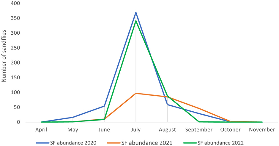 In Slovenia, sandflies are widespread throughout the country, although there are notable regional differences in population structure. Phlebotomus neglectus, P. perniciosus and P. papatasi are mainly found in the Mediterranean and Karst regions of Slovenian Istria, while P. mascitii is present in all areas studied. However, the greatest species diversity is observed in areas with a Mediterranean climate. The data from 3 years of research show that sandfly activity peaks in July (Figure 3), similar to what is observed in the neighboring Italian regions of Friuli-Venezia Giulia and Veneto (27) and in Austria (12). Our results suggest that the sandflies in this region only produce one generation per season due to the climatic conditions.