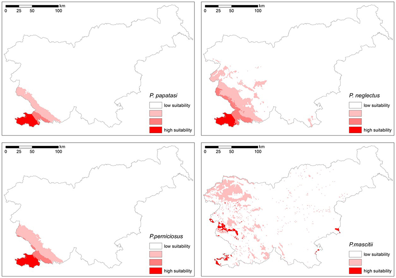 Environment suitability models show that the studied species have different habitat preferences. Phlebotomus papatasi, P. neglectus and P. perniciosus show a strong preference for the south-western part of Slovenia, particularly in the coastal and Karst regions, and are very limited for other areas. In contrast, P. mascitii has a much broader potential range, covering almost the entire country. This suggests that P. mascitii can thrive in a range of environmental conditions, including higher altitudes and potentially cooler or wetter regions. These distribution patterns are consistent with the environmental preferences observed in Austria and Slovakia (12, 15). Despite its wide distribution range, P. mascitii is not very abundant and is most frequently detected in Slovenian Istria, with significant populations found in Medljan and Velike Žablje.