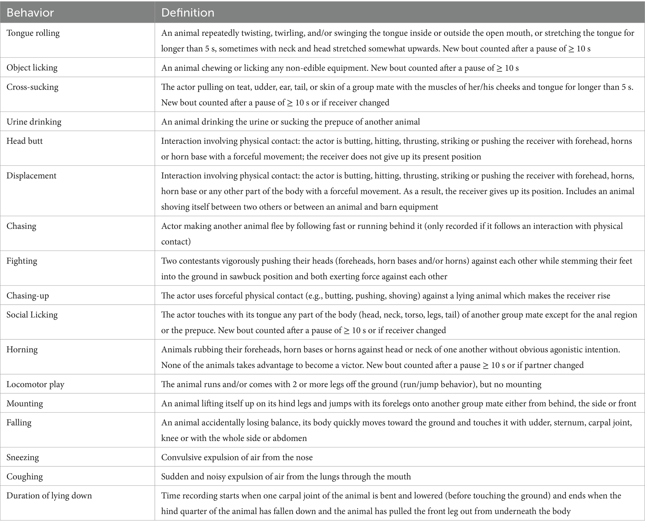 Behavior was observed quantitatively for 60 min for calves and heifers each. Duration was equally split between calves aged 0–2 and 3–6 months and heifers aged 7–12 and > 12 months, i.e., the behavior of each age category was observed for 30 min, leading to a total observation time of 120 min across the four groups (43). Behavior was observed continuously. The maximum group size that was observed at the same time was 20 animals, and observations were always carried out from outside the pen. If the group was bigger or there were several groups within an age category, more than one observation point was defined, and the total observation time was split among the observation points for each category. The assessors only started the observation a few minutes after taking the position at the observation point to minimize influences on the animals’ behavior resulting from their presence. At the beginning of each observation, the number of animals lying, feeding/drinking and standing was noted down. The ethogram can be found in Table 2.