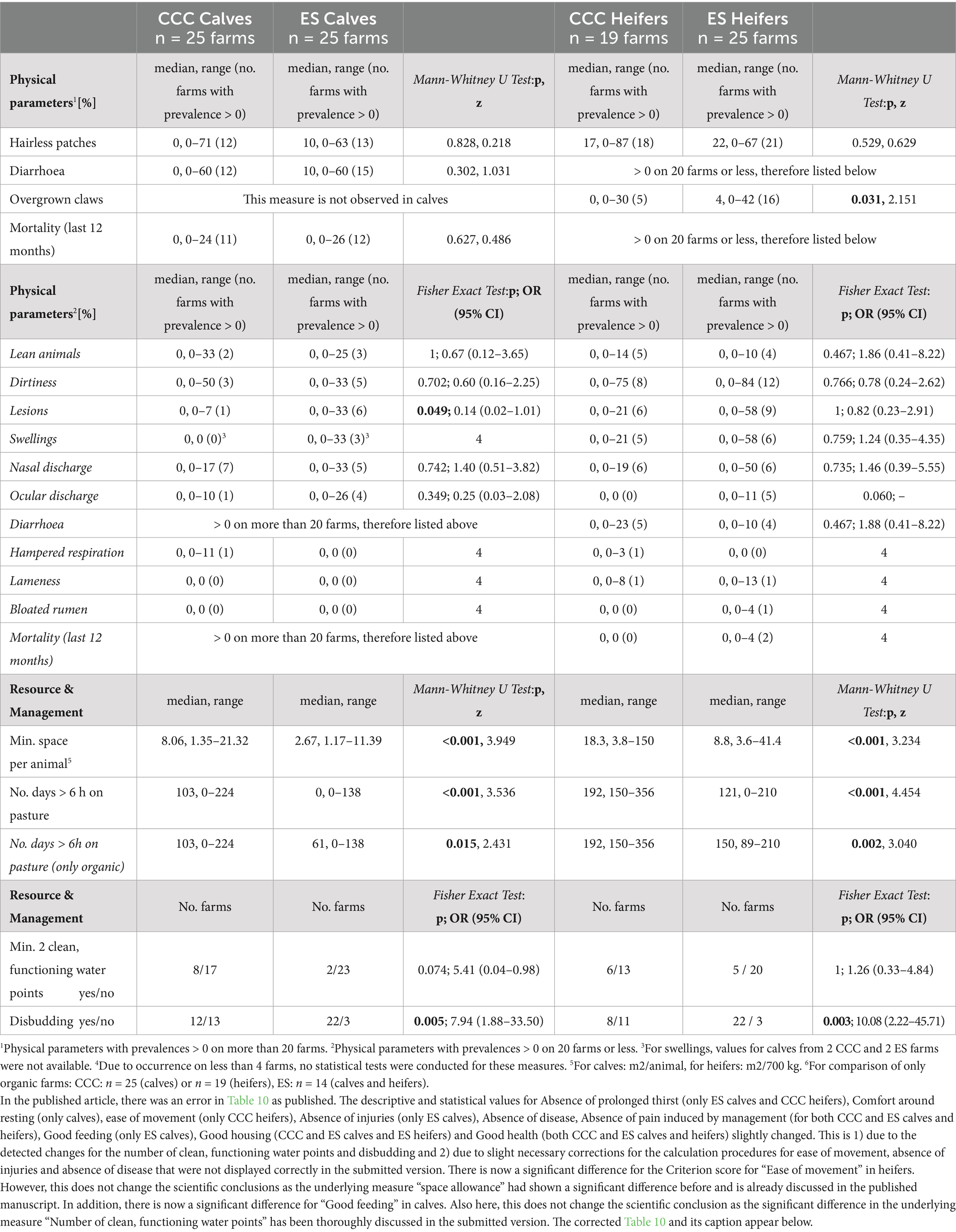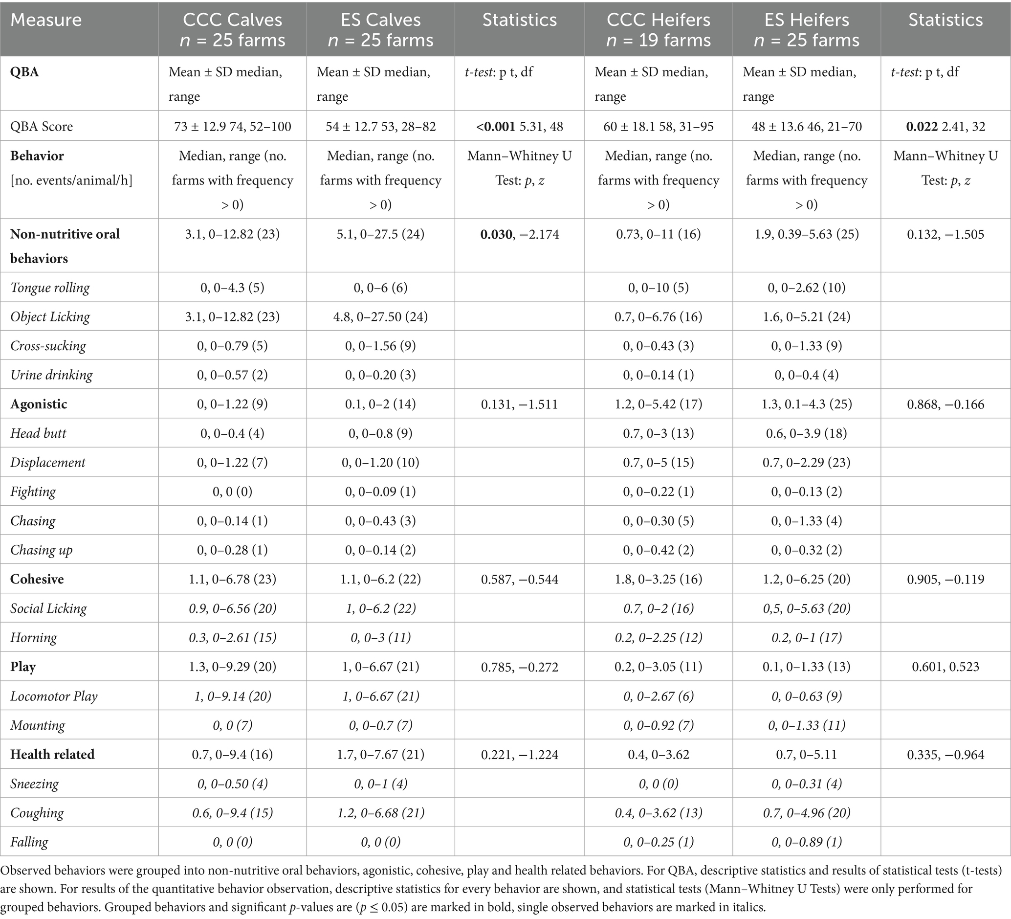 Statistical analysis was performed using IBM SPSS Statistics Version 29.0.2.0 (58). All the measures except for AD were analyzed on farm level. Behaviors were grouped into agonistic (headbutt, displacement, fighting, chasing, chasing up), non-nutritive oral behaviors (tongue rolling, object licking, cross-sucking, urine drinking), cohesive (horning, social licking), play (mounting, locomotor play) and health related (coughing, sneezing, falling). For physical measures with high non-occurrence, i.e., a prevalence = 0 at ≥ 30 farms, the variable was dichotomized, i.e., the occurrence of the measure on the farm (yes/no) was compared between CCC and ES farms. This was the case for lean animals (occurrence on 5 farms for calves, 9 farms for heifers), dirtiness (8/20), lesions (7/15), swellings (3/11), nasal (12/12) and ocular (5/5) discharge and lameness (1/2) in calves and heifers and for diarrhea (9) in heifers (Table 4). All the visited farms were included in each analysis, i.e., for calves: CCC: n = 25, ES = n = 25; for heifers: CCC: n = 19, ES: n = 25.