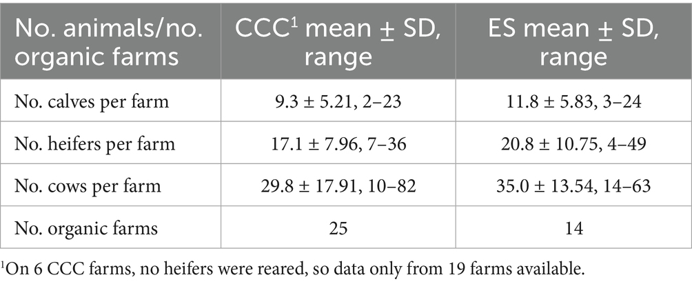 That both CCC calves and heifers had more space and more access to pasture, even when comparing CCC with only organic ES farms as those are required by law to provide their animals with access to pasture (96), aligns with our hypothesis of CCC farmers providing their animals with better management practices. This is in line with the results from previous studies: providing their animals with a more natural environment that enables extensive possibilities for species-specific behavior, a core aspect of organic farming also recognized in the EU Organic legislation, is an important value for many farmers practicing CCC, making them more likely to oppose unnatural practices including ES (32, 96, 99). This aligns with the argumentation that ES can be considered as a violation of the principle of fairness, one of the four principles of organic agriculture (100, 101) and fits with our and the findings of others that CCC is mainly practiced on organic farms (102). Moreover, providing animals with the opportunity to engage in natural behaviors they are strongly motivated to perform, such as going on pasture (103) and CCC (104), have been emphasized as an important aspect also in a broader context of sustainability (38). As CCC and ES farms were balanced for geographical regions, location of the farm should not have influenced the amount of pasture provided. This suggests that for CCC farmers, access to pasture might not only be seen as a necessary aspect to maintain organic status but also as an important factor to fulfil the animals’ behavioral needs.