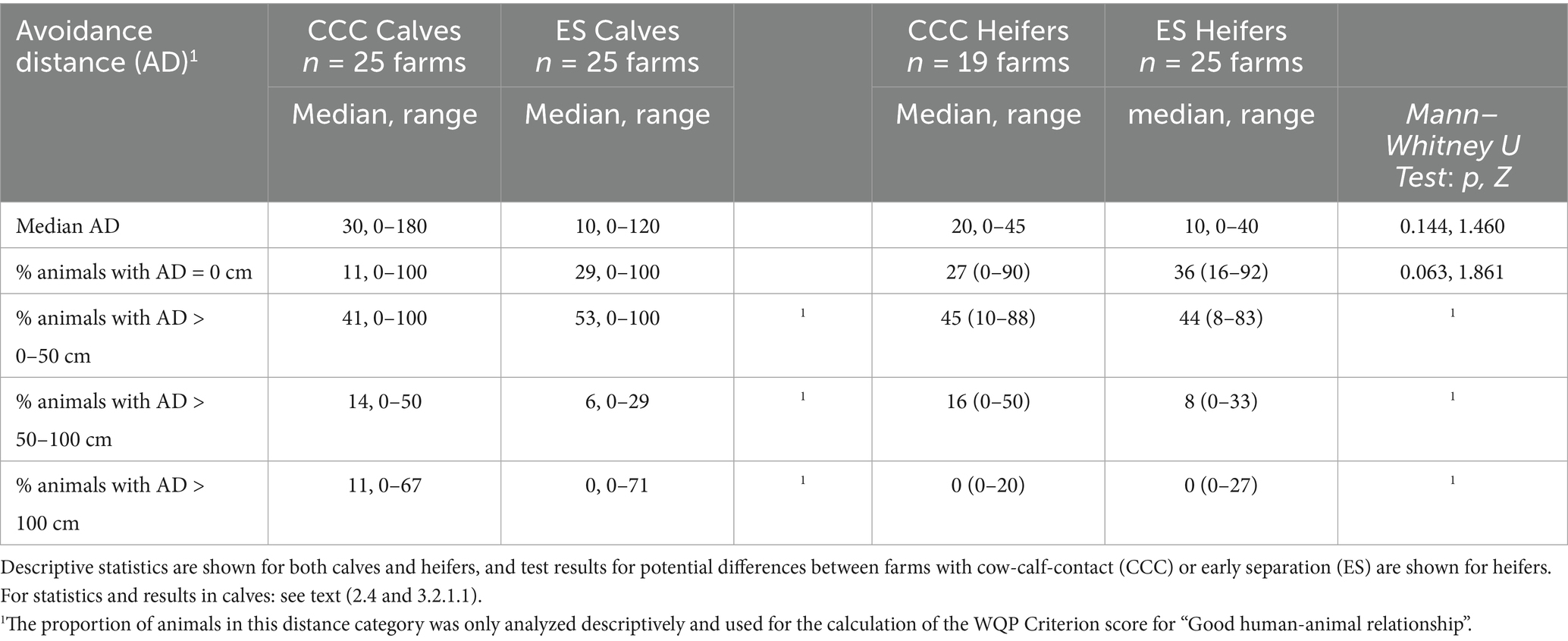 Table 7 shows farm values of AD (median and percentage of animals in distance categories according to the WQP). Models for AD in calves showed an effect of test location (F2,396 = 24.913, p < 0.001) with AD being lowest for single boxes, slightly higher for grouped-housed animals tested at the feeding place and highest when tested in barn. There was no effect of rearing system on AD in calves (F1,44 = 1.295, p = 0.261, back-transformed estimated means CCC: 27.6 cm, n = 170 calves; ES: 18.8 cm, n = 233 calves) nor of age category. The model with the proportion of animals that accepted touch (AD = 0) also revealed an effect of location (F2,31 = 5.752, p = 0.007) but no effect of rearing system (F1,47 = 0.001, p = 0.976, estimated means CCC: 33.7%; ES: 34.0%) nor age category. Farm had a highly significant effect (p < 0.001 for AD and p = 0.002 for AD = 0). There was no influence of rearing system on median AD in heifers (Table 7).