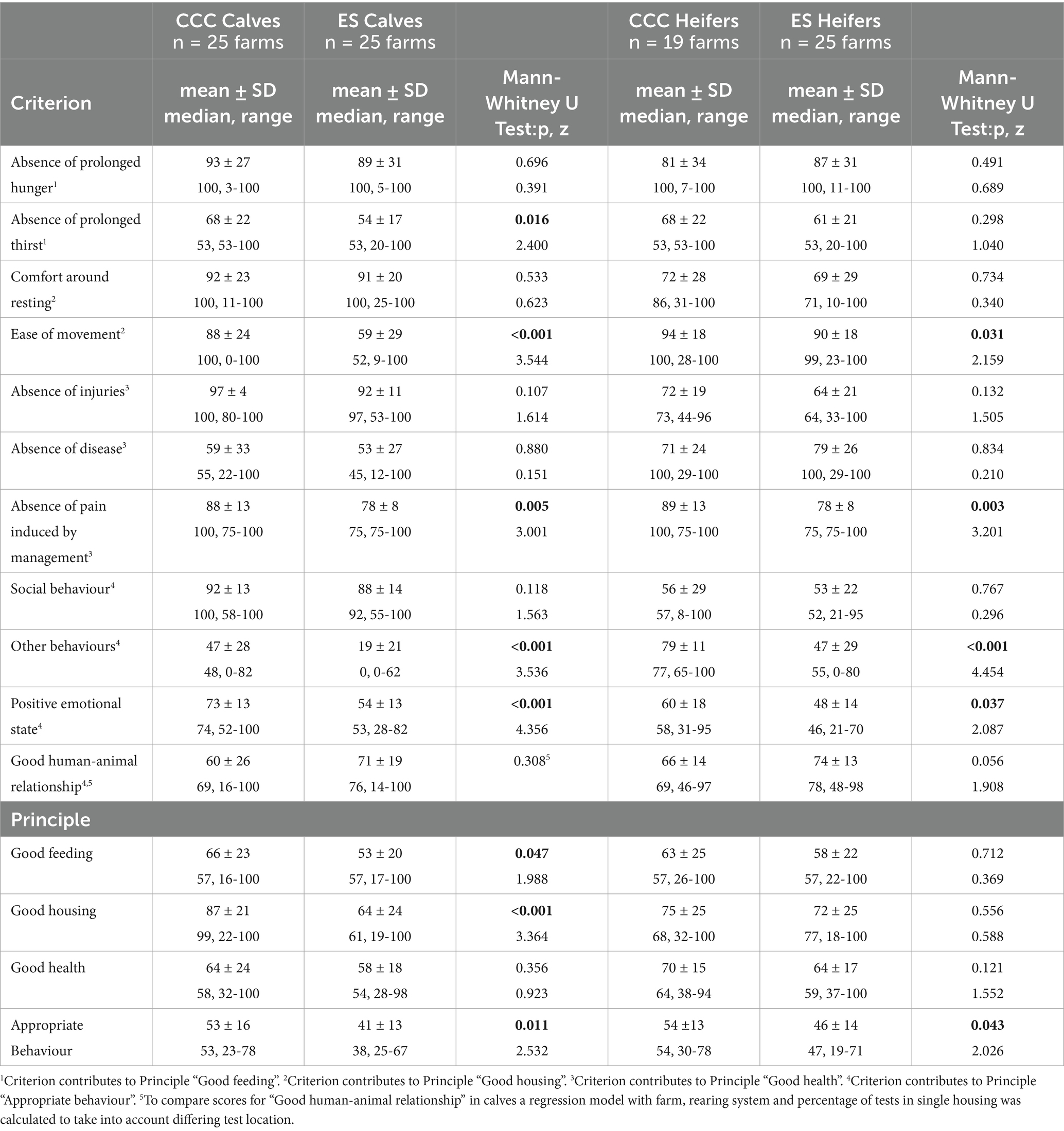 The results of this study confirm our hypothesis of better welfare of calves and heifers on CCC compared to ES farms. This was mainly the case in the dimensions of behavior and mental states including resource- and management-based measures, while there was only a limited effect in the physical dimension. Specifically, CCC calves and heifers showed higher scores for positive emotional state (QBA), had more space, more access to pasture and were less often disbudded compared to ES calves and heifers. In addition, CCC calves showed a lower frequency of non-nutritive oral behaviors, had lesions only on one CCC farm and, in contrast to those on ES farms, were never single housed except for one farm post-weaning. Fewer CCC farms had heifers with overgrown claws. The results led to higher WQ scores for CCC farms in five of the 11 Criteria for calves, four of the 11 Criteria for heifers, three of the four Principles for calves and one of the four Principles for heifers and a higher overall classification for calves for CCC farms. The results thus also confirm our hypothesis that benefits of CCC rearing are more pronounced in calves compared to heifers.