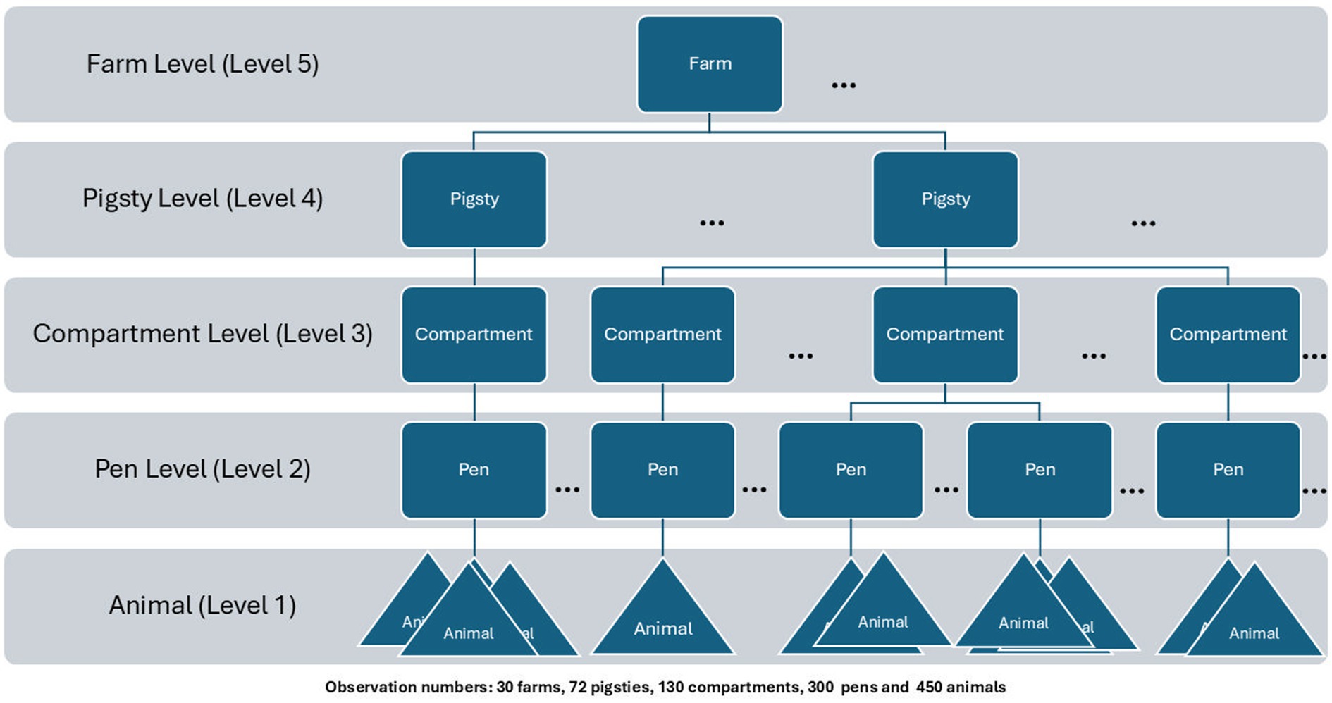 Hierarchical regression extends classical regression by handling clustered data structured across multiple levels (see Figure 1). Here, the goal is to account for the variability at each level to analyze cluster effects (5). The key elements are varying coefficients and a model for these coefficients, possibly incorporating cluster-level predictors—features that distinguish hierarchical models from classical ones. Here, we examine frequentist hierarchical models and compare their applicability in the context of cough prevention in pig production.