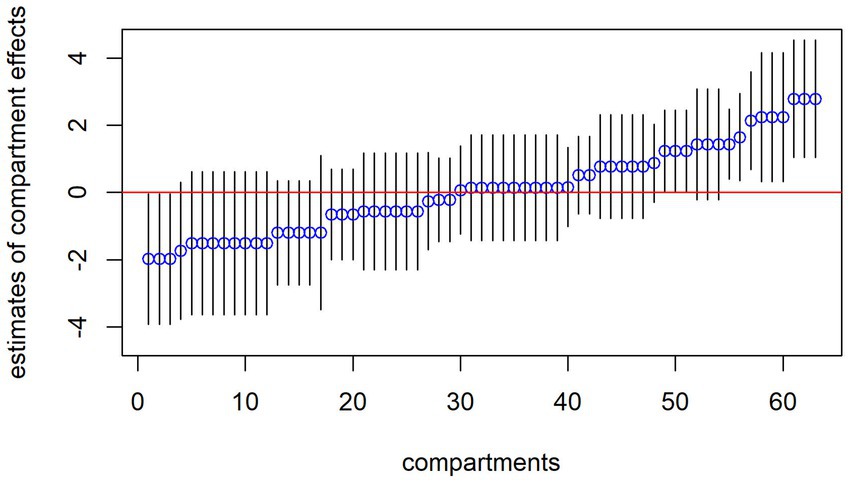 Before including explanatory variables in the model, the estimates of the compartmental effects or residuals, have to be considered in more detail. These are calculated from the FM 2. Figure 2 plots these conditional modes of the random compartment effect with all 63 compartments in total in rank order along with the associated 95%-confidence intervals. The graph shows the estimated residuals for all compartments in the sample after remaining preprocessing. For nine of the 63 total compartments, the 95%-confidence intervals do not overlap with the horizontal line at zero, indicating that coughing in these compartments is above average. The confidence intervals are quite wide for some compartments, which is in line with the restricted sample sizes within these compartments. A corresponding graph (for FM 2) of the pen effects would simply consist of a horizontal line at zero, so this is not shown here.