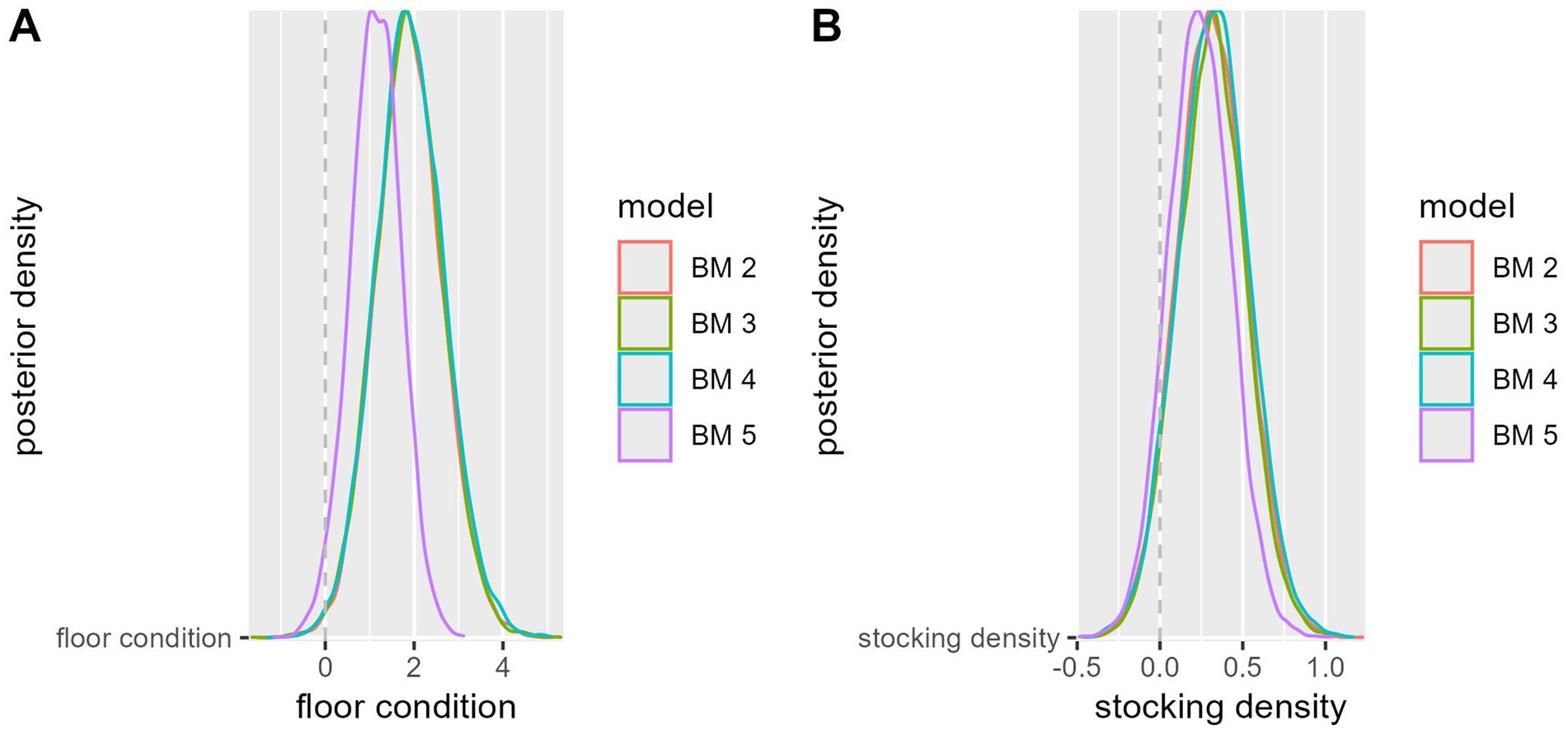 Figure 3. Posterior density distribution for different models (BM 2 – BM 5) in relation to floor condition (A) and stocking density (B).