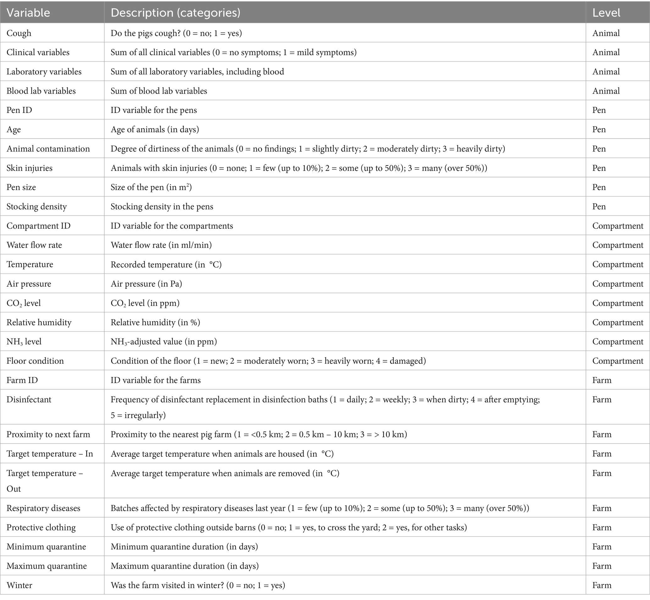 For this, 30 piglet-producing farms with recurring respiratory tract disease problems in weaners were selected for an in-deep investigation. Overall, data was enrolled within 72 pigsties, 130 compartments, and 300 pens respectively, and finally from 450 single animals. Although all farms were part of a common veterinary network, they were managed independently and did not belong to the same corporate ownership. Thus, differences in management style, resource availability, and biosecurity adherence exist. To partially control for such unobserved heterogeneity, we used hierarchical modeling with random effects at the compartment and pen levels, which helps account for unmeasured clustering effects. However, we acknowledge that certain latent factors at the farm level—such as corporate protocols or feeding systems—were not directly modeled and may introduce unmeasured confounding. This limitation is discussed later in the discussion Section.