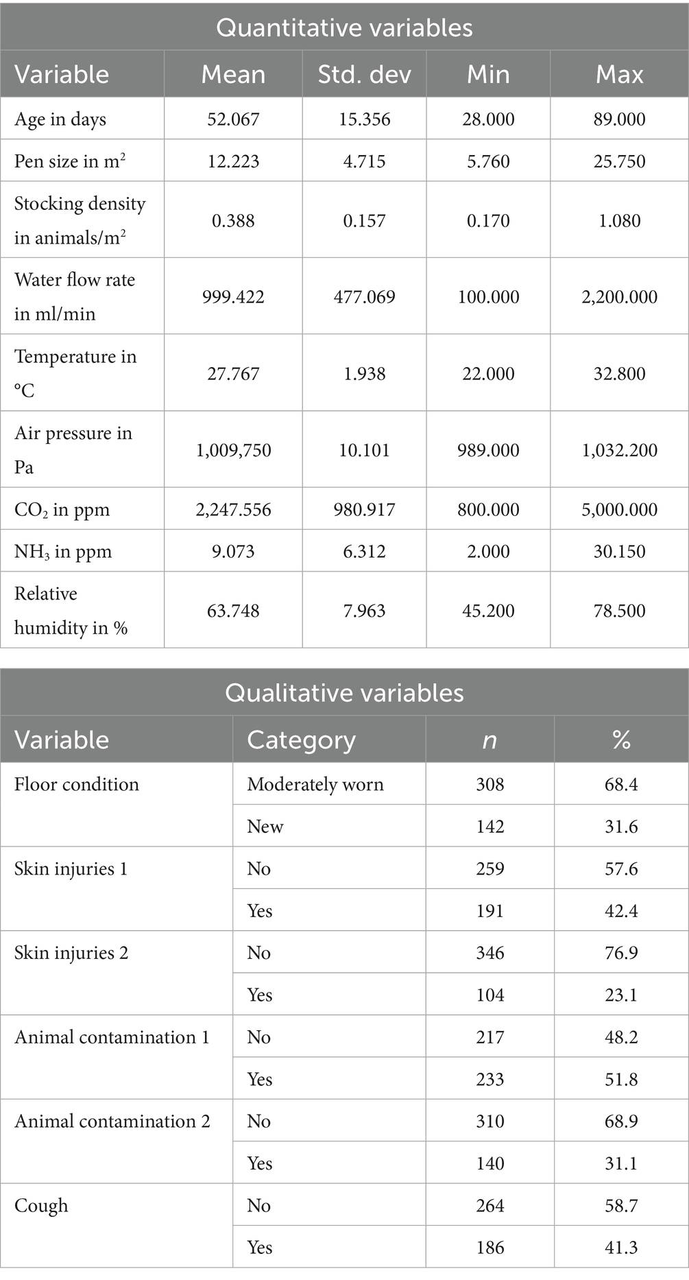A total of 450 animals were included in this study. The average age of the animals was approx. 52 days, with an age range of 28 to 89 days. The average pen size was approximately 12 m2, with a range of 5.760 to 25.750 m2. The stocking density averaged 0.388 animals per m2, i.e., 1 animal per 2.577 m2. Floor conditions were predominantly classified as moderately worn (68.4%), while only a small proportion of pens were classified as new (31.6%). The water flow rate averaged 999 mL/min, with a range from 100 to maximum values of up to 2,200 mL/min. The average temperature was a pleasant 27.8 °C. The mean air pressure was approximately 1,009.8 Pa, with a range from a minimum of 989 Pa to a maximum of 1,032 Pa. The CO2 value averaged about 2,248 ppm and ranged from 800 ppm to 5,000 ppm; while the NH3 value averaged about 9.1 ppm and varied between 2 ppm and 30 ppm. The relative humidity of approximately 63.8%, which varied between 45.2 and 78.5%.