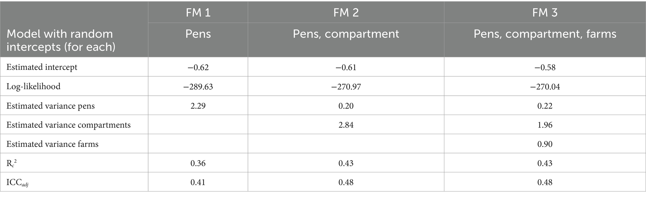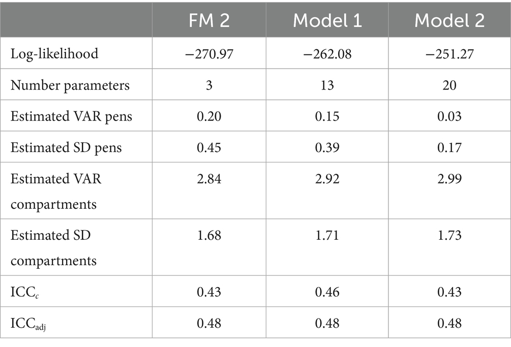 Table 5. Measures for model specificity comparing FM 2 (a random-intercept-only model with pens nested in compartments), Model 1 and Model 2.