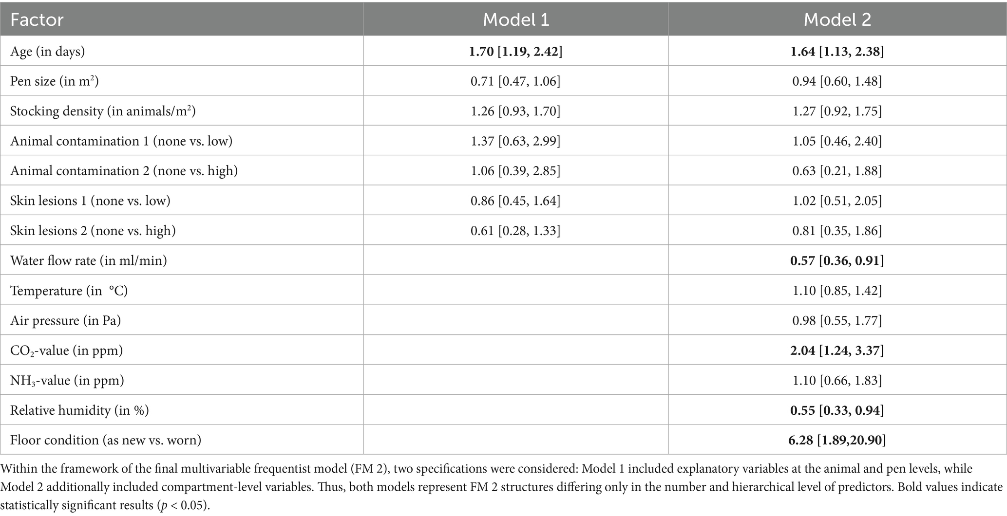 Subsequently, explanatory variables are included in the model in addition to the random intercepts. The starting point is initially the FM 2 from above. For model 1 the variables collected at pen level are included first. These are the age of pigs in a specific pen, the pen size or the stocking density in a pen and others. Model 1 assumes that the relationship of the explanatory variables with cough is the same across pens or compartments. Furthermore, we now add explanatory variables collected at the compartment level to our model. For both models, a random intercept is allowed for each of the pens or compartments. Table 4 shows the resulting odds ratios with associated 95%-confidence intervals for the fixed effects of the fitted hierarchical logistic regression models (FM 2), where model 1 has explanatory variables for pen level and model 2 has explanatory variables for the pen- and compartment level.