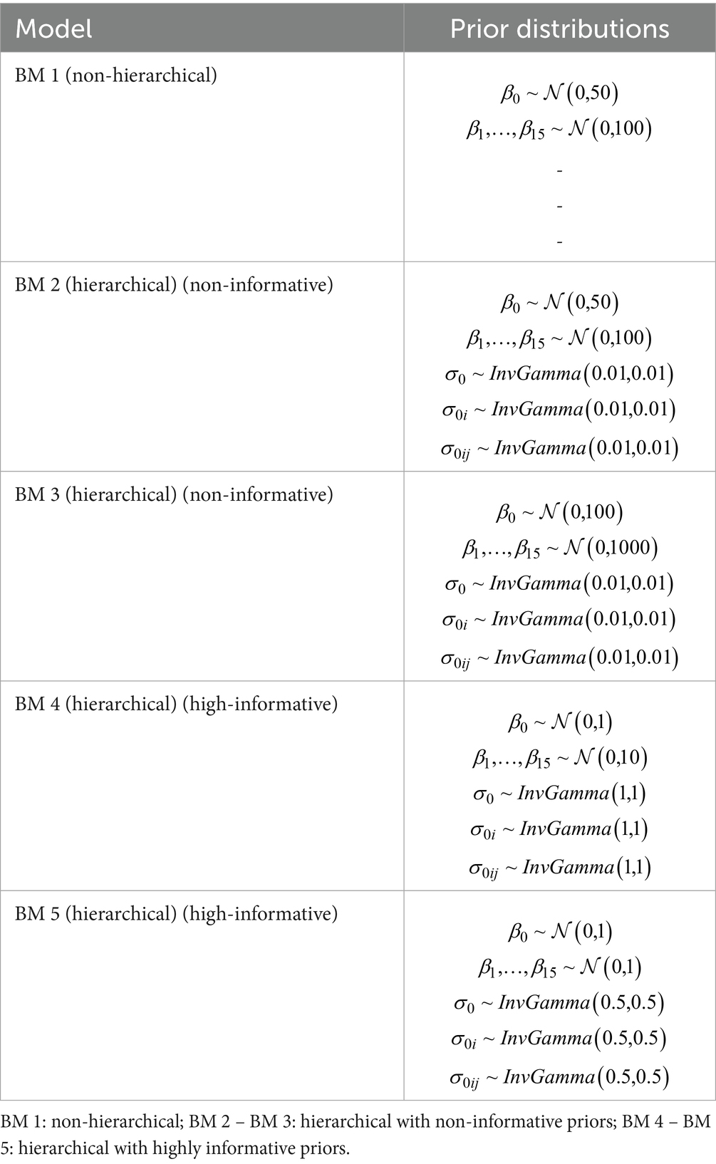 In this investigation, we compare the final multivariable frequentist hierarchical model (FM 1–3) with three Bayesian logistic regression models: a non-hierarchical model with non-informative priors (BM 1), a hierarchical model with non-informative priors (BM 2 and 3), and a hierarchical model with highly informative priors (BM 4 and 5). While additional frequentist models were used during model development (e.g., univariable screening), only the final model (FM 2) was used for direct comparison with the Bayesian models.