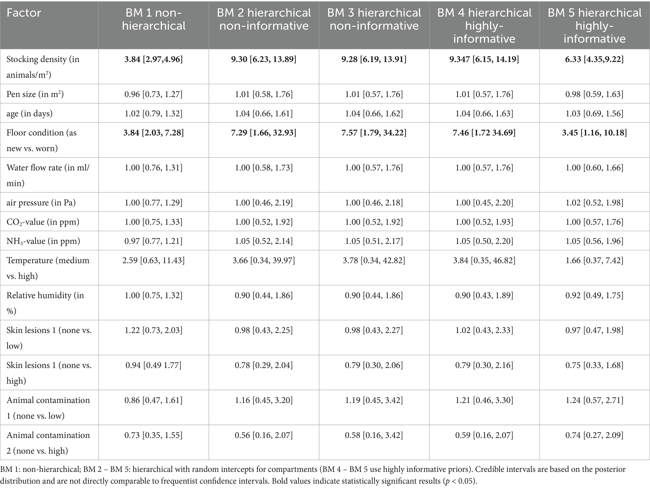 The resulting estimated odds ratios and their associated 95% credibility intervals were as follows (Table 7): for stocking density in BM 1 (non-hierarchical), it was estimated at 3.84 with a credibility interval of [2.97, 4.96]. In contrast, BM 2 (hierarchical; non-informative) showed an odds ratio of 9.30 [6.23, 13.89], while BM 3 (hierarchical; non-informative) had an odds ratio of 9.28 [6.19, 13.91]. For BM 4 (hierarchical; highly informative), stocking density yielded an odds ratio of 9.34 [6.15, 14.19], and BM 5 (also hierarchical; highly informative) resulted in an odds ratio of 6.33 [4.35, 9.22].