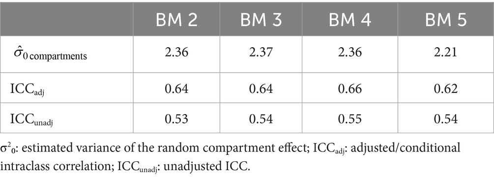 So far, only the fixed effects have been studied. However, both models have also allowed random intercepts for pens and compartments. The values of the estimated variances (VAR), standard deviations (SD), the log-likelihood function and intraclass-correlation (conditional and adjusted), for the comparison of the models are shown in Table 5. Here we notice that the estimated variances and standard deviations for the pen effects are close to zero for all our models. Adding explanatory variables significantly reduces the estimated variance across compartments, suggesting that the distribution of one or more variables varies across compartments.