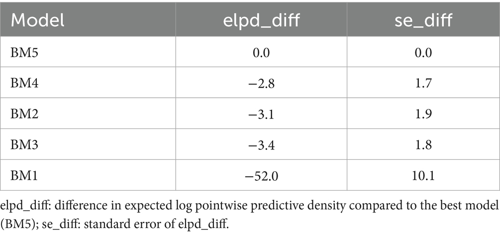 Generally model BM 5 served as the reference with the best predictive performance, while BM 1 showed a substantial drop in performance. Convergence diagnostics were monitored using the Rhat statistic derived from MCMC samples generated with tools like Stan (via the rstan package in R). All chains converged well (Rhat < 1.01), confirming the reliability of the parameter estimates.