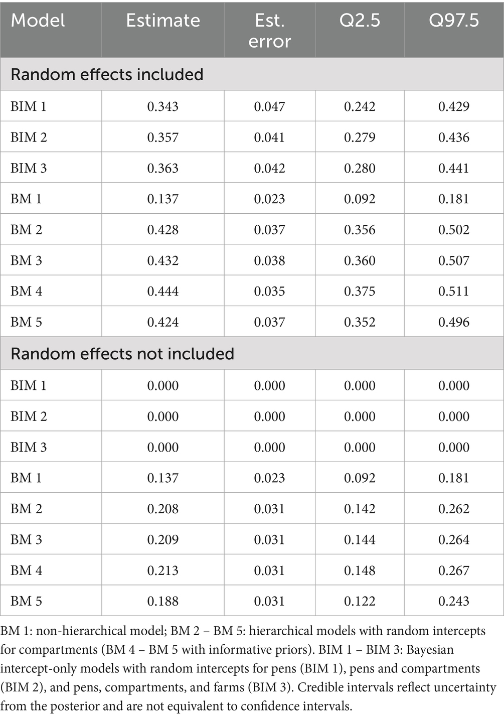 The ICC further breaks down the variance by measuring the proportion attributable to the random grouping factors (such as compartments or pens). This measure is critical for hierarchical models as it quantifies the degree of similarity within clusters. An adjusted ICC, which considers only the variance of the random effects relative to the total variance (random effects plus residual error), provides insight into the cluster-specific influence on the outcome. In the Bayesian models, a single intra-class correlation coefficient (ICC) value was calculated based on the posterior distributions of the random effects. Specifically, the ICC was derived as the median of the posterior samples for the ratio of the random effect variance to the total variance (sum of the random effect variance and residual variance). This approach allows for a representative point estimate from the posterior distribution and follows the general recommendation for hierarchical models as outlined by Gelman and Hill (4). For the evaluation of the Bayesian models, Leave-One-Out Cross-Validation (LOO-CV) was employed to assess predictive performance. The LOO approach was implemented using the loo package in R, which provides an efficient approximation of out-of-sample prediction error based on the expected log pointwise predictive density (elpd). Detailed results and comparisons between models using LOO are presented later in Section 3.4.