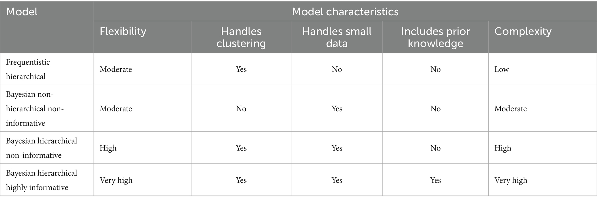 Some of these recommendations support the findings of our analysis, while others offer alternative perspectives that enrich the discussion. For example, Burnham and Anderson (32) emphasize that model selection should be based on multiple criteria – such as parsimony, explanatory power, and convergence behavior – rather than relying solely on fit indices like AIC or BIC. This aligns with our approach of balancing interpretability and model performance. Similarly, McNeish and Stapleton (40) caution against using complex hierarchical models in small-sample contexts without careful consideration, echoing our observation that hierarchical modeling can lead to instability if not adequately supported by the data. Conversely, other studies highlight the value of Bayesian approaches in sparse or nested data scenarios. For instance, Gelman and Hill (4) and McElreath (11) advocate for the use of multilevel Bayesian models, particularly when dealing with complex data structures and uncertainty across levels. These perspectives confirm that there is no one-size-fits-all solution in model selection; instead, the choice depends on the structure of the data, the research questions, and practical considerations such as computational cost and interpretability.