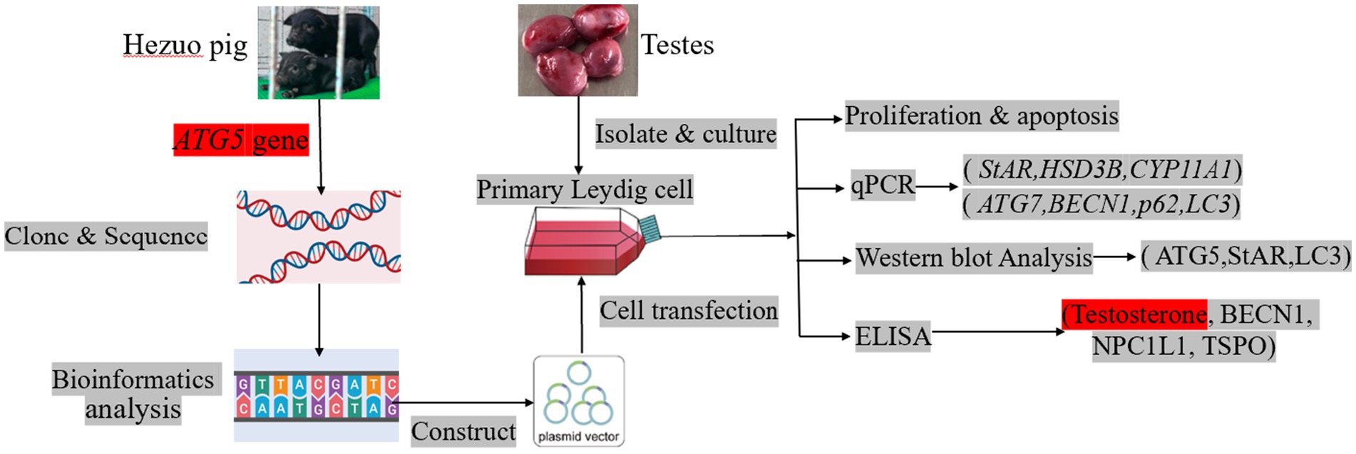 This study focused on the Hezuo pig, the ATG5 gene was cloned and sequence analysis was performed. Subsequently, Leydig cells from Hezuo pig were isolated. Based on successful transfections with ATG5 silencing and overexpression vector, the effects of ATG5 overexpression and silencing on testosterone levels, BECN1, NPC1L1, TSPO were explored using ELISA assays; autophagy gene (BECN1, ATG7, p62 and LC3) and testosterone synthesis gene (StAR, HSD3B, and CYP11A1) were detected by qPCR; ATG5, StAR and LC3 were detected by Western Blot, aiming to elucidate the molecular mechanisms by which ATG5 regulates testosterone synthesis in testicular Leydig cells of Hezuo pigs, with the goal of investigating the reproductive endocrine basis underlying the characteristic precocious puberty trait in this breed.