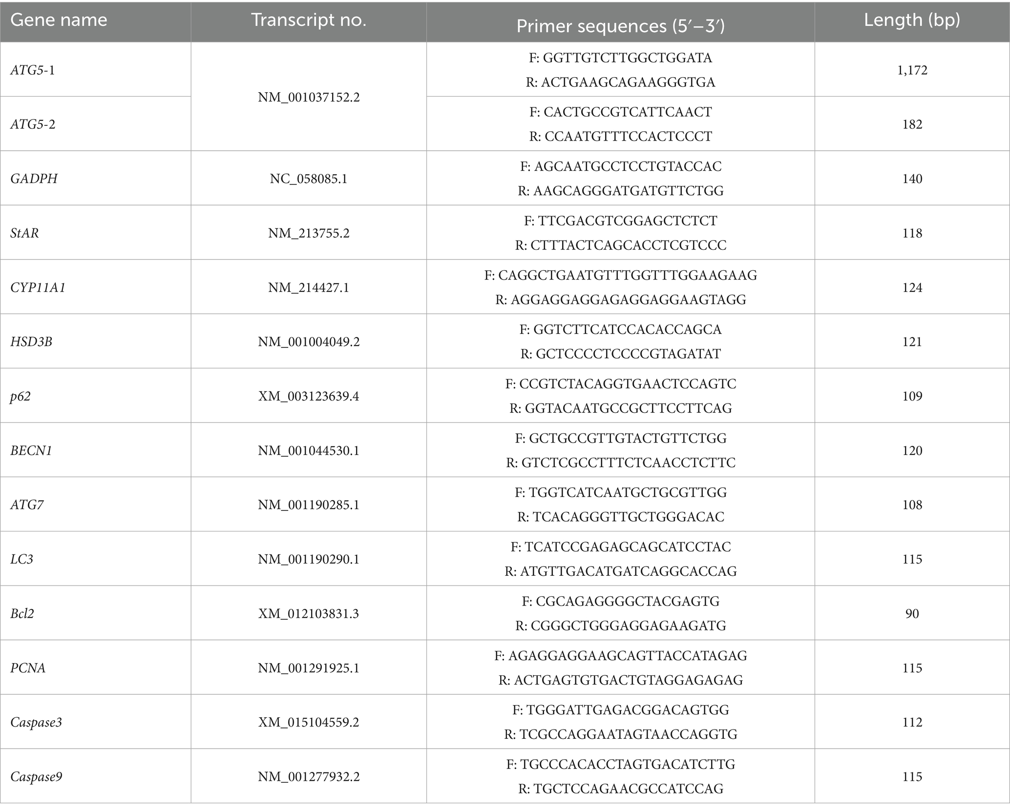 Autophagy is a fundamental cellular process in eukaryotic cells, involving a metabolic pathway that transports damaged or dysfunctional intracellular components to the lysosome for degradation and recycling. This process is essential for maintaining normal cellular functions (1). Autophagy plays a role in various biological processes, such as mammalian follicular development (2), regulation of circadian rhythms (3), germ cell development (4), synthesis of steroid hormones (e.g., testosterone (5, 6), estrogen (7), progesterone (8, 9)), and maintenance of pregnancy (10). Autophagy is regulated by numerous conserved autophagy-related genes (11). In 1997, the first autophagy-related gene, ATG1, was cloned by A. Matsuura et al., and it plays a key role in initiating autophagy (12). To date, approximately 40 autophagy-related genes have been identified (13). Among these genes, ATG5, which is widely expressed in eukaryotes, regulates the autophagic ubiquitination process and plays a crucial role in the early stages of autophagosome formation and the initiation of autophagy (14). ATG5 initially forms an ATG5-ATG12 complex with ATG12, which subsequently interacts with ATG16 to form a homodimer. The ATG5-ATG12-ATG16 complex promotes the elongation and expansion of the autophagosome membrane, as well as the activation of autophagy (15–17).