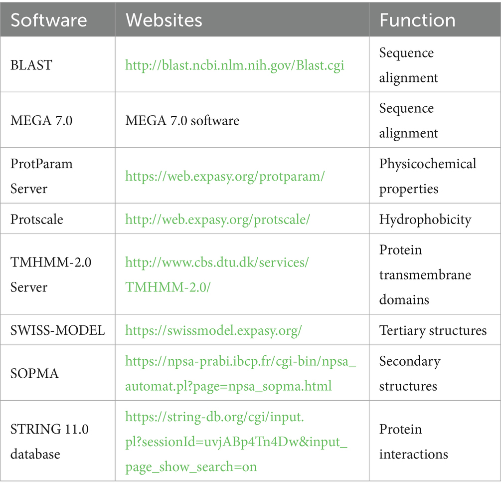 The CDS region of the ATG5 gene obtained by cloning was analyzed using various online tools and databases. Homologous sequences were identified using the BLAST tool on the NCBI website. Details of the specific software and websites used are provided in Table 2.