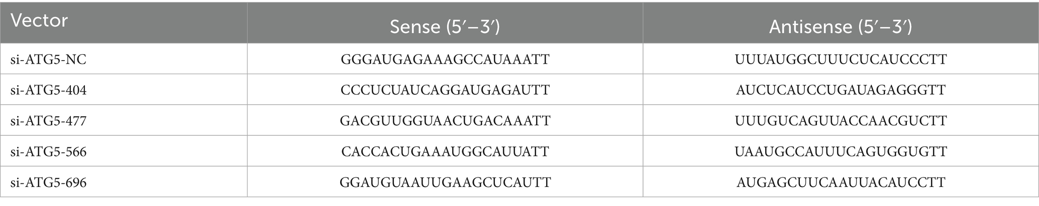 Based on the gene clone sequence, si-ATG5-404, si-ATG5-477, si-ATG5-566, and si-ATG5-696 interference sequences were designed. The negative control (si-ATG5-NC) served as the control group. The interference sequences are listed in Table 3. The ATG5 overexpression vector (ATG5-OE) was constructed using the pcDNA 3.1 cloning vector, employing 5’ HindIII and 3’ BamHI restriction sites. The empty vector (ATG5-PC) served as a control. The silencing and overexpression vectors were synthesized by GenePharma Biotech Co., Ltd. (Shanghai, China).