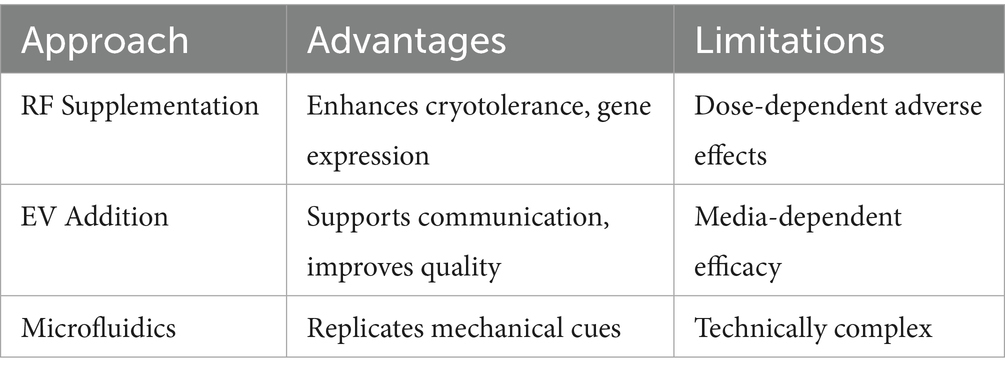 RF supplementation aims to reproduce the complex maternal-conceptus communication that occurs in vivo, which involves multiple “omics” pathways, paracrine/autocrine signals, and stage-specific molecular cues. These interactions are dynamically influenced by the presence of gametes and embryos and evolve throughout development (33–35). Therefore, the culture medium must be tailored to match the changing needs of the developing embryo.