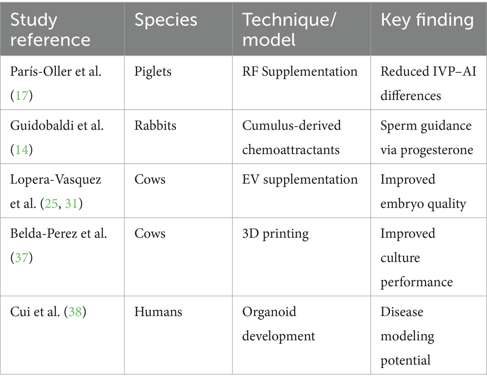 Recent attention has also focused on extracellular vesicles (EVs) found within RFs. EVs differ between oviductal regions and act as key messengers in embryo–maternal communication. Studies suggest that supplementing in vitro culture systems with OF-derived EVs can enhance embryo quality and/or development by influencing, among other, gene expression and lipid metabolism (25, 36).