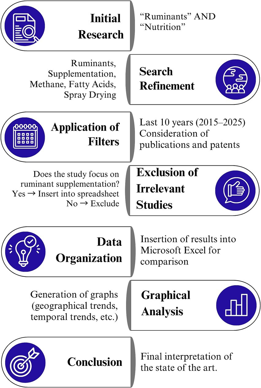 The research, therefore, consisted of searches for topics related to nutrition, ruminant supplementation, and methane mitigation. The scope was subsequently refined by including specific terms such as microencapsulation by spray drying, lipids, and the use of tannins, applied to both patents and scientific articles. From this delimitation, only studies aligned with the objective of ruminant feed supplementation were considered. At the same time, those addressing other methods of animal nutrition or health, as well as alternative approaches to methane mitigation (e.g., vaccines and technologies aimed at feed administration or distribution), were excluded. The methodological steps are summarized in Figure 1.