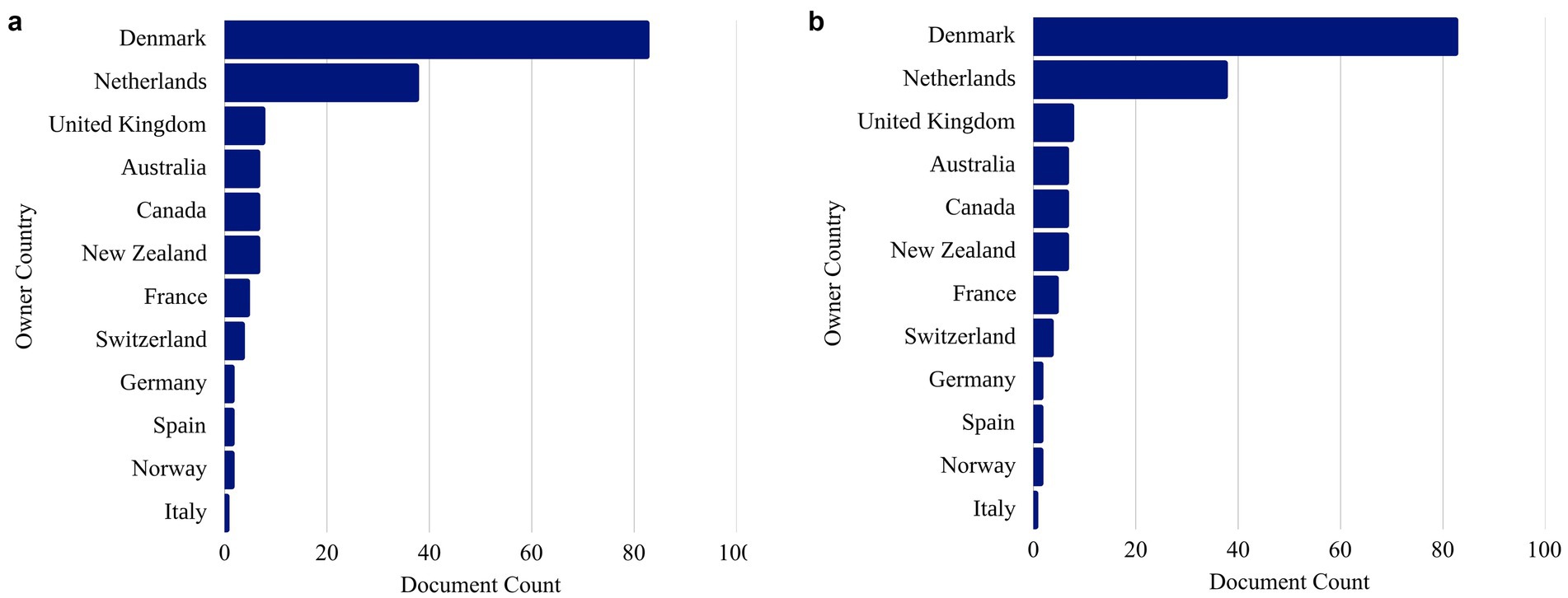 Figure 2. (a) Graph of patent document filings by country between 2015 and 2025 (based on Search 5). Source: The Lens, 2025. (b) Graph of scientific publication filings by country between 2015 and 2025 (based on Search 5). Source: The Lens, 2025.