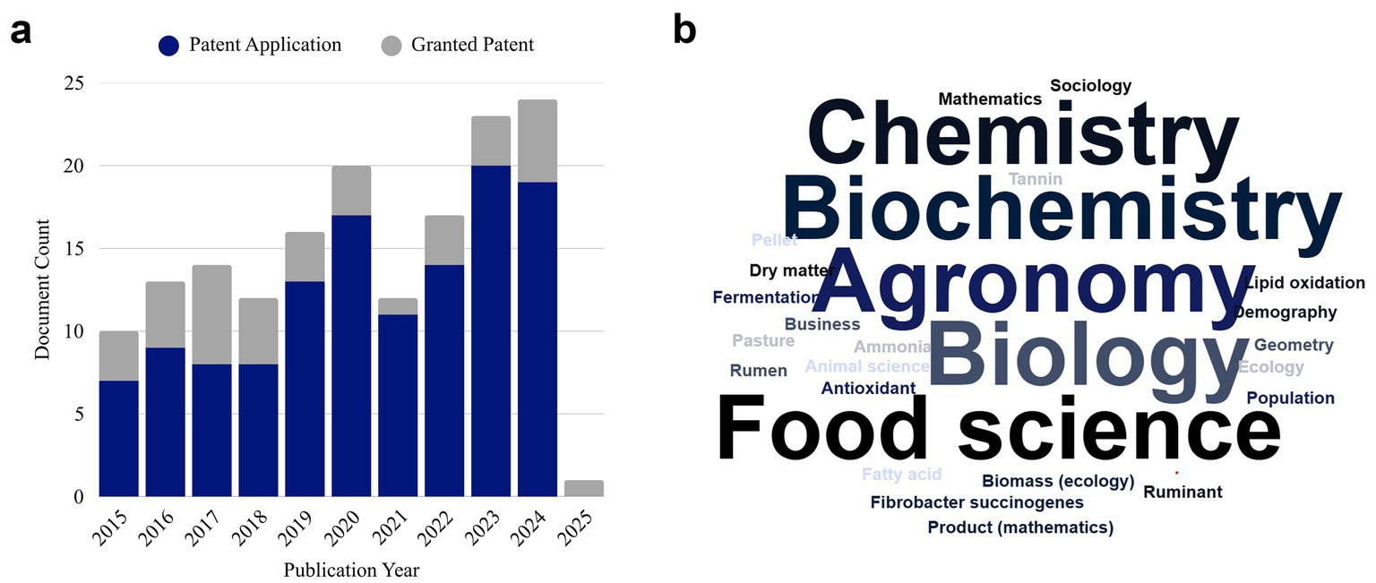 Figure 3. (a) Patent documents related to lipid microencapsulation with tannins filed between 2015 and 2025 (based on Search 5). Source: The Lens, 2025. (b) Keywords identified in scientific publications related to lipid microencapsulation with tannins between 2015 and 2025 (based on Search 5). Source: The Lens, 2025.