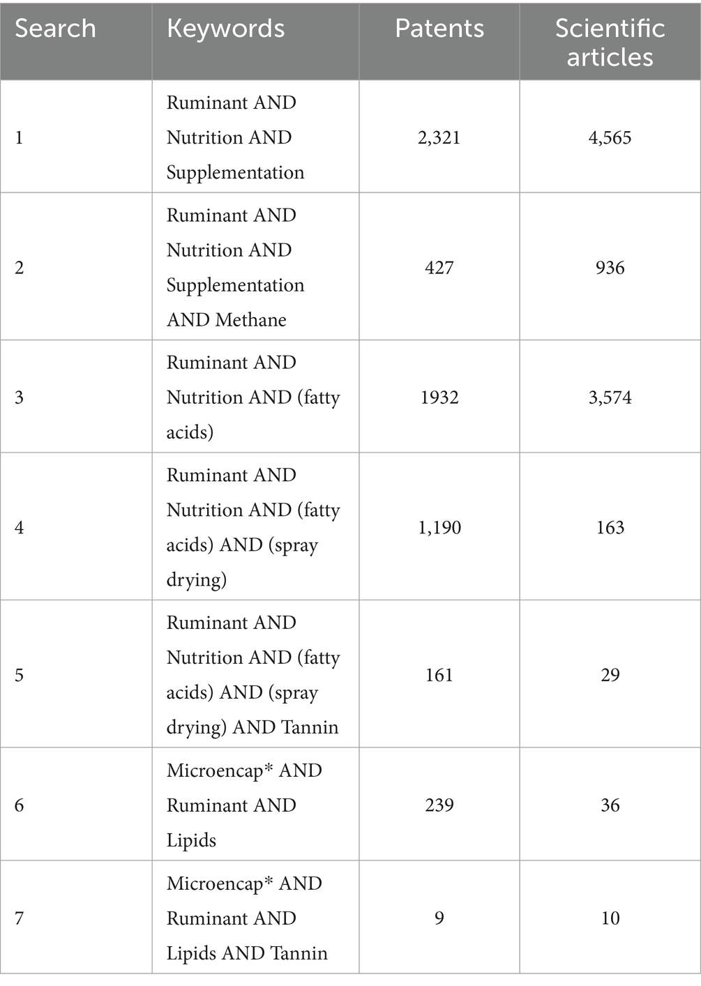 These challenges have motivated the search for methods that promote stability and site-specific (post-rumen) release of fatty acids, particularly through microencapsulation technology, which is widely applied to enhance the stability of compounds (45). Consequently, lipid matrix microencapsulation has become a reference for delivering nutrients to the ruminant small intestine, as evidenced by 1,990 patents and 163 publications in Search 4 and 239 patents and 36 publications in Search 6, respectively (Table 1).