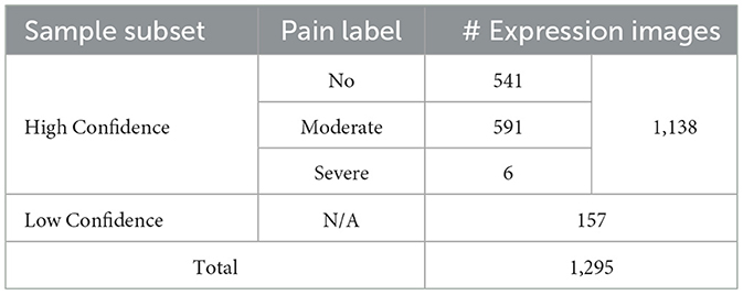 Based on the two-stage labeling scheme, three or four high-confidence AU-level pain scores for 1,138 of 1,295 images are eventually attained. And the rounded mean of the AU-level pain scores was hence applied as the image-level pain label for each expression image. In addition, as for the left 157 images, their image-level pain labels weren't appointed because of massive low-confident AUs.