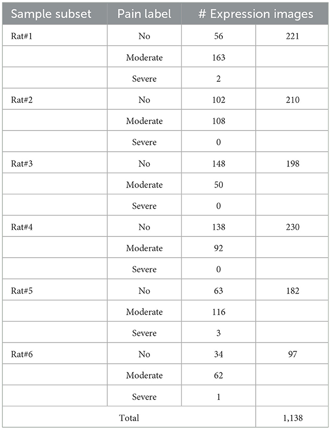 Second, we present the F1-score and Accuracy achieved by every rat across all methods shown in Table 3. The results figure out an intriguing trend, with consistently significant performance differences exists Rats#3 and #4 compared to the remaining rats across nearly all methods. This finding inspires us to take the potential of a class-imbalanced problem in pain assessment via facial expressions into account when employing samples from these rats as the testing set. It is known that an extremely class-imbalanced problem existing in the training set can affect the effectiveness of machine learning approaches (39). To investigate this aspect, we present the training and testing sample numbers across all folds of our experiments in Table 4. Furthermore, it is evident that the gap between “No Pain” and “Pain” training sample numbers exceeds 100 (the second most severe) for Rat#4 and surpasses 150 for Rat#3 (most severe). Consequently, all methods exhibit inferior performance when using Rat#3 as the testing subject compared to Rat#4, as shown in Table 4. Therefore, further investigation is warranted to explore this aspect and mitigate this interference in the development of both deep learning and machine learning methods for evaluating rats' pain through facial expressions.