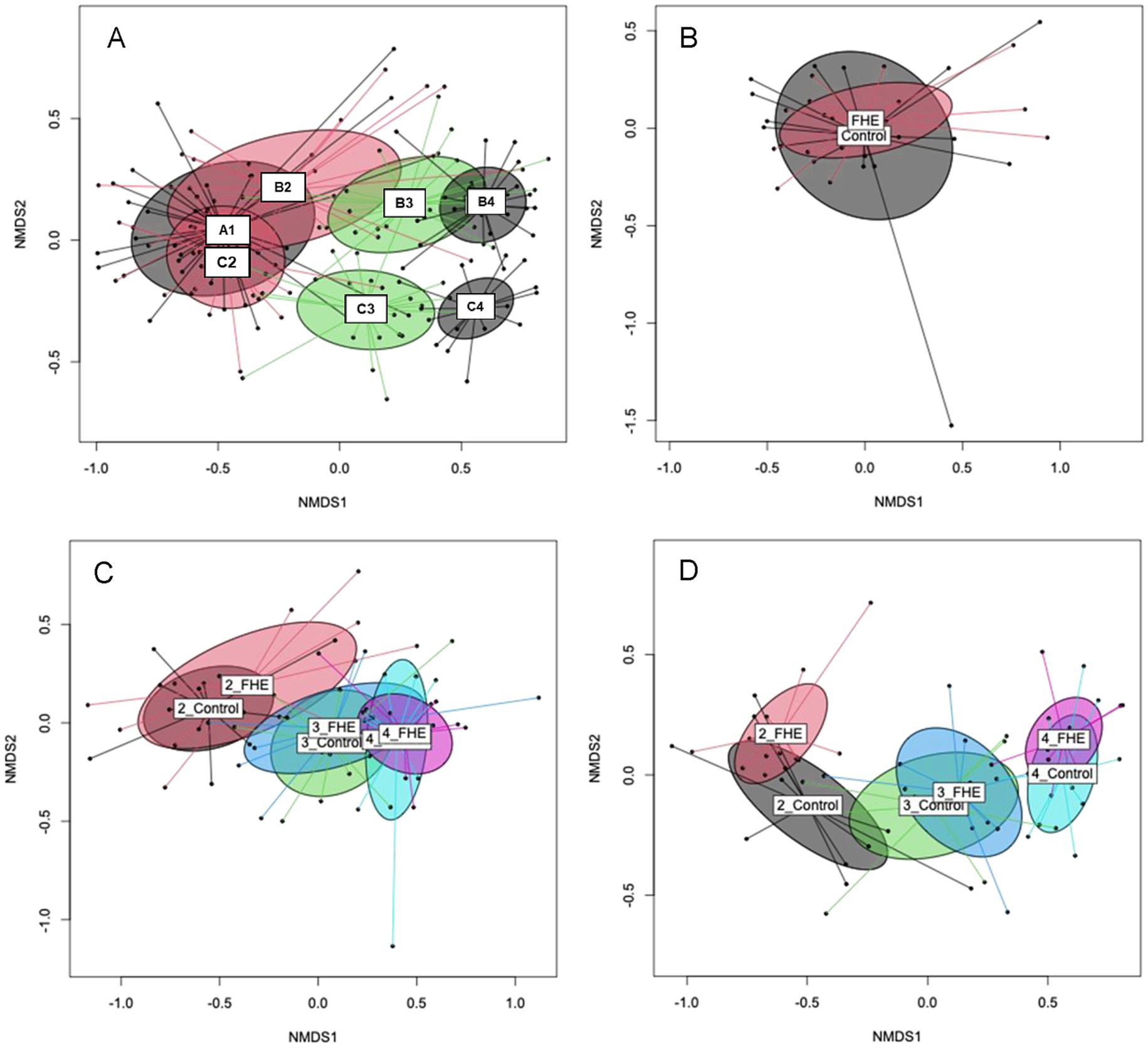 Figure 1. Non-metric multidimensional scaling (NMDS) plot of pairwise Bray–Curtis dissimilarities in the bacterial communities in feces for production stages of all farms (A), treatments (FHE, Control) in weaner period (A1) on Farm A (B), treatment groups at the different production stages [weaner (B2), mid- (B3), end of fattening (B4)] on Farm B (C) and treatments at the different production stages [weaner (C2), mid- (C3), end of fattening (C4)] on Farm C (D). Ellipses represent the standard deviation. 2_FHE, weaner period and fermented herbal extract diet; 2_Control, weaner period and control diet; 3_FHE, weaner period and fermented herbal extract diet; 3_Control, weaner period and control diet; 4_FHE, weaner period and fermented herbal extract diet; 4_Control, weaner period and control diet.