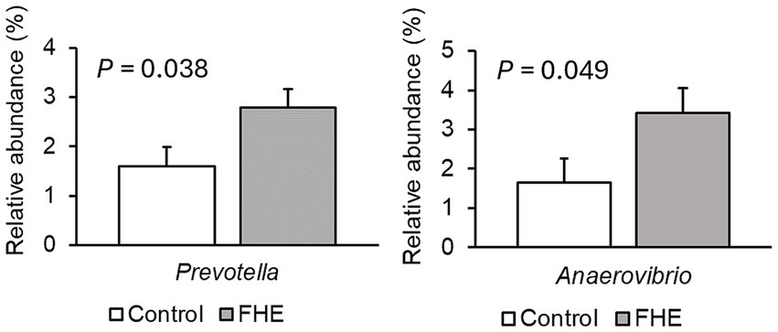 Only very few differences in the relative abundances of bacterial genera existed between sexes. Therefore, only dietary effects on the relative abundances of genera are presented (Figures 2–4; Supplementary Tables S5–S7). The FHE effects differed for the three farms and for the three sampling time points in the weaner and fattening period. On Farm A (Figure 2; Supplementary Table S5), the FHE increased the relative abundance of Prevotella and Anaerovibrio by 7.4 and 10.9%, respectively, compared to the control diet, in the mid-weaner period (p < 0.05). On Farm B (Figure 3; Supplementary Table S6), the FHE decreased (p = 0.006) Lactobacillus from 12 to 7% relative abundance but simultaneously increased other genera such as Clostridium sensu stricto 1 (p = 0.077), Turicibacter (p = 0.040), Alloprevotella (p = 0.064), and Christensenellaceae R-7 group (p = 0.068) from 0.7- to 9-fold in feces compared to the control diet in the weaner period. In the mid-fattening period, the effects of FHE were different. They were limited to an increase in Blautia and Romboutsia by 5.4- and 2.3-fold, respectively, while decreasing an unclassified Lachnospiraceae genus (Lachnospiraceae XPB1014 group) by 0.5-fold compared to the control diet (p < 0.10) on Farm B. At the end of the fattening period, the FHE decreased the relative abundance of the Prevotellaceae NK3B31 group by 0.5-fold while increasing the abundance of Turicibacter and Treponema by 0.5- and 0.8-fold, respectively, compared to the control diet on Farm B (p < 0.05). On Farm C (Figure 4; Supplementary Table S7), the FHE affected (p < 0.05) or tended (p < 0.10) to affect nine genera. This included an increase in the relative abundance of the Prevotellaceae NK3B31 group, Megasphaera, Lactobacillaceae HT002, Coprococcus, and Phascolarctobacterium by 0.9-, 0.8-, 0.8-, 0.5-, and 0.3-fold, respectively, and a decrease in Prevotella, Turicibacter, Alloprevotella, and Romboutsia by 0.5- to 10-fold compared to the control diet at the end of the weaner period. In the mid-fattening period, the FHE increased (p = 0.024) the relative abundance of one genus, Prevotella, by 0.7-fold, whereas at the end of the fattening period, two genera responded to the FHE (decrease in Alloprevotella and increase in Romboutsia by 0.4-fold each; p < 0.05) compared to the control diet on Farm C.