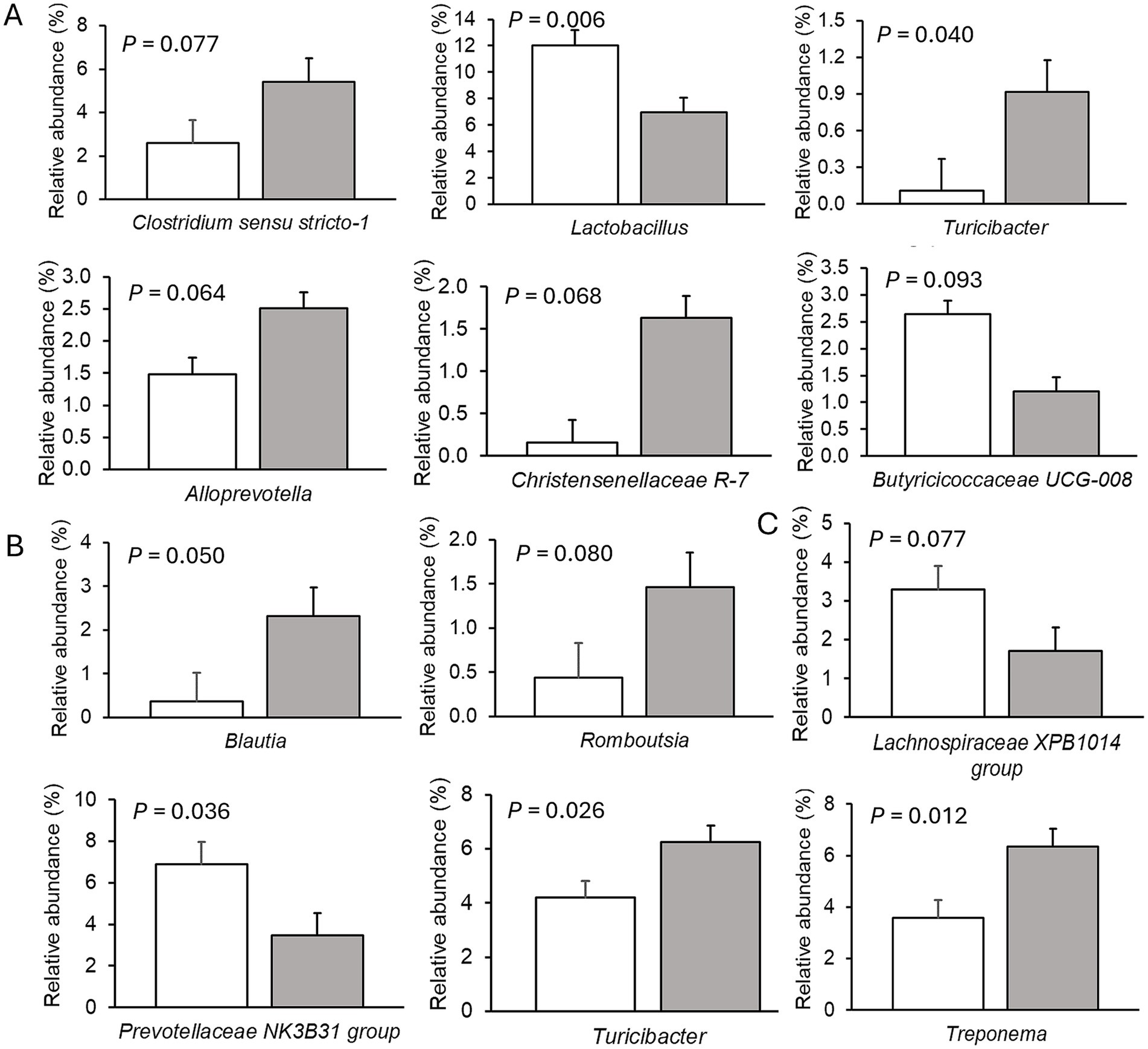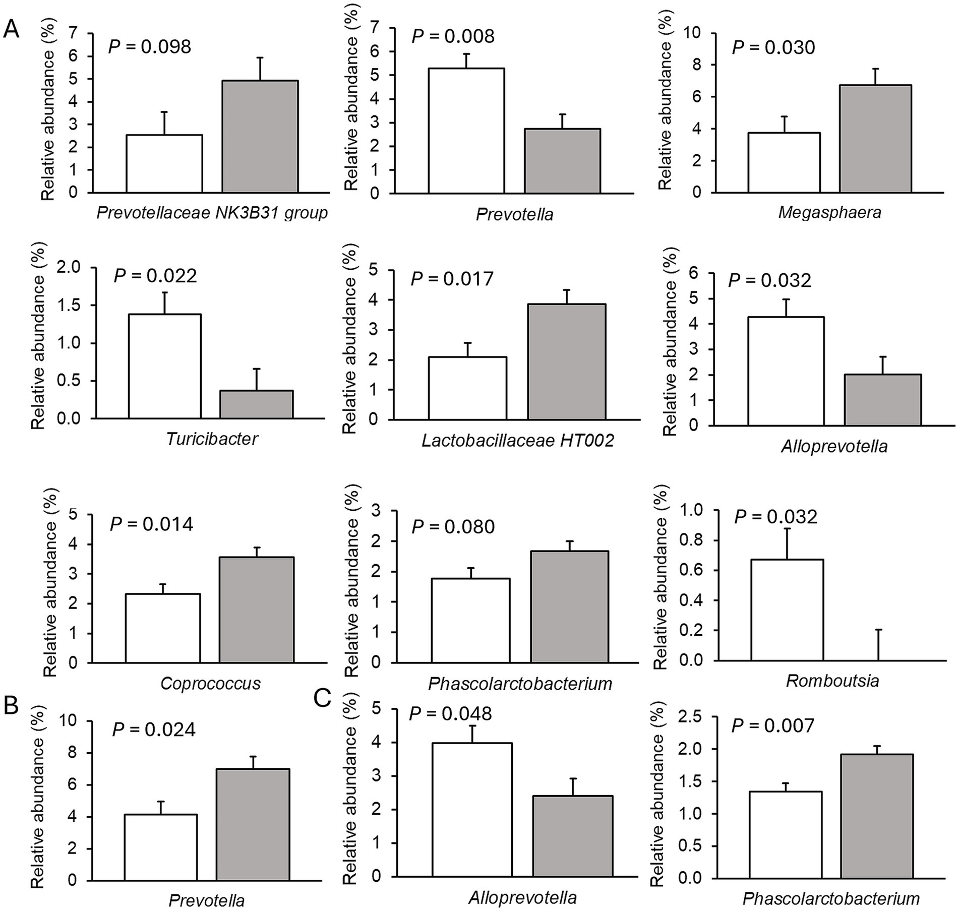 Figure 4. Differences in relative abundances (% of all reads) of bacterial genera in feces of pigs fed the control diet (white bar) or diet with added fermented herbal extract (grey bar) on Farm C. (A) Weaner period, (B) mid-fattening period, and (C) end of fattening period. Values are least-squares means ± standard error of the mean.
